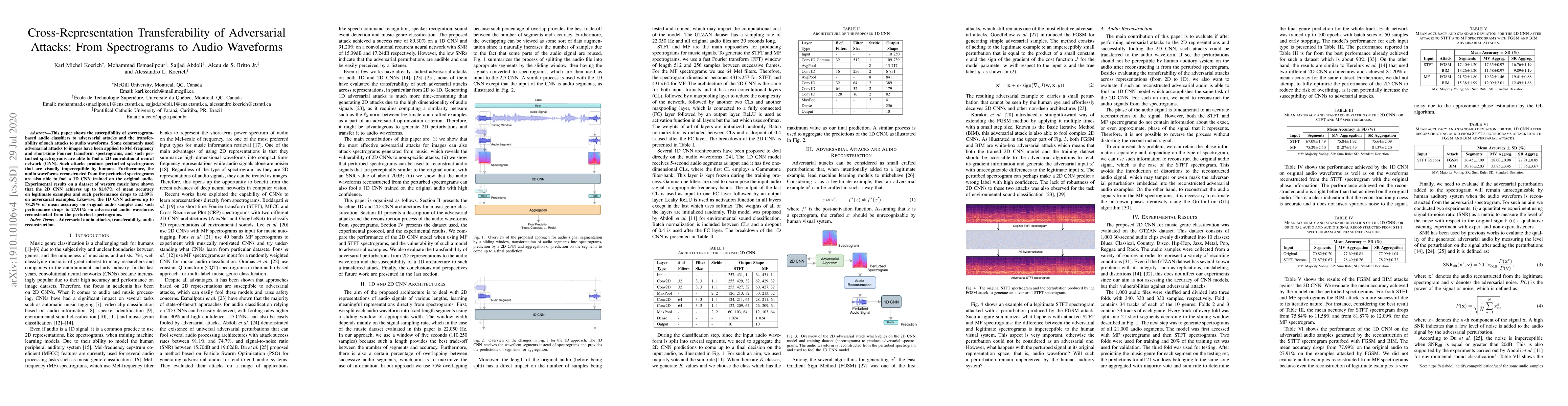 This research investigates the transferability of adversarial attacks from spectrogram-based audio classifiers to audio waveforms, demonstrating significant performance drops in both 2D and 1D convolutional neural networks. The findings highlight the vulnerability of audio classification systems to imperceptible perturbations in spectrograms, which can effectively deceive both 2D and 1D CNNs.