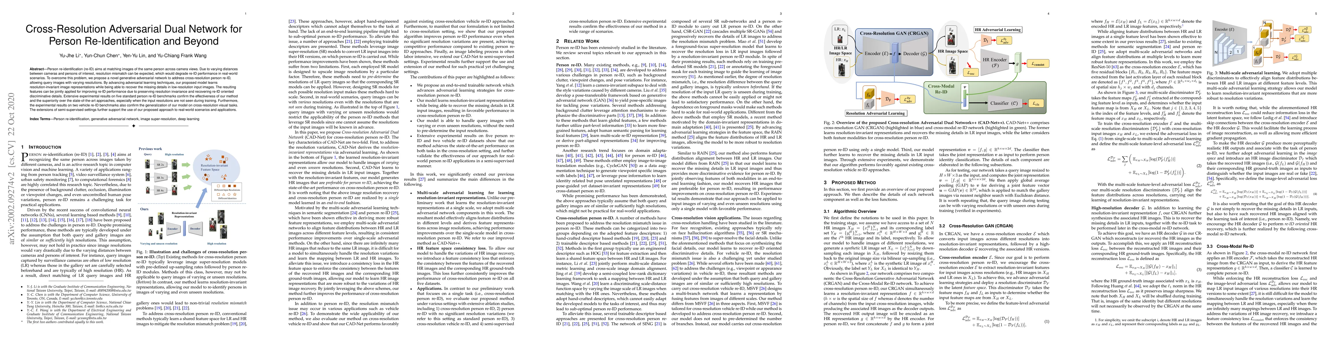 This paper proposes a Cross-Resolution Adversarial Dual Network for enhancing person re-identification across varying image resolutions. The model leverages generative adversarial learning to create resolution-invariant representations and recover details in low-resolution images, achieving superior performance on standard re-ID benchmarks and demonstrating generalization to vehicle re-ID tasks.