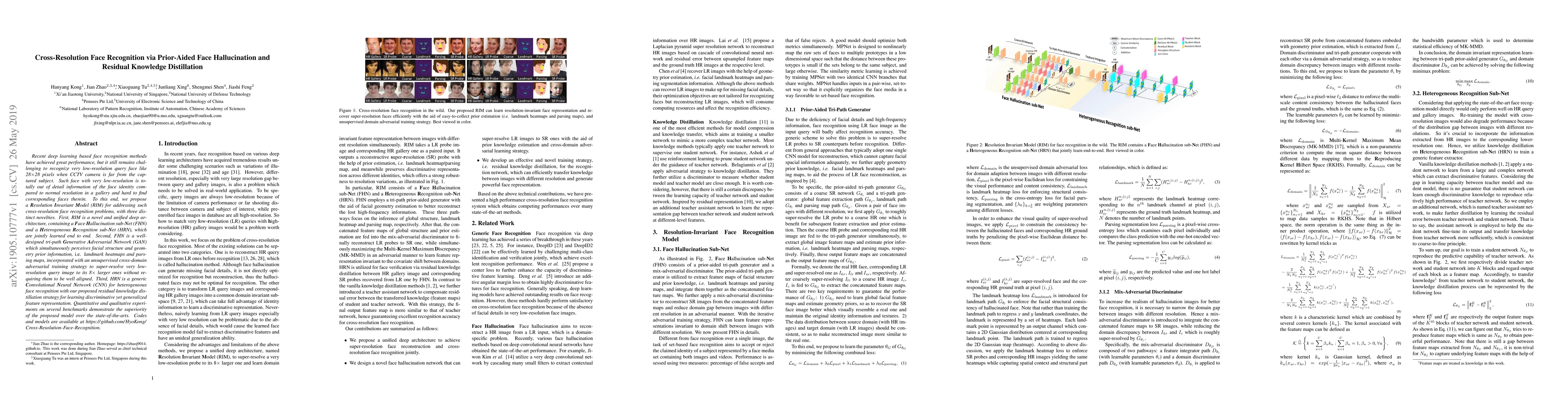 This paper proposes a Resolution Invariant Model (RIM) for cross-resolution face recognition, featuring a Face Hallucination sub-Net (FHN) to super-resolve low-resolution images and a Heterogeneous Recognition sub-Net (HRN) with residual knowledge distillation for effective recognition. The model outperforms state-of-the-art methods on benchmarks.