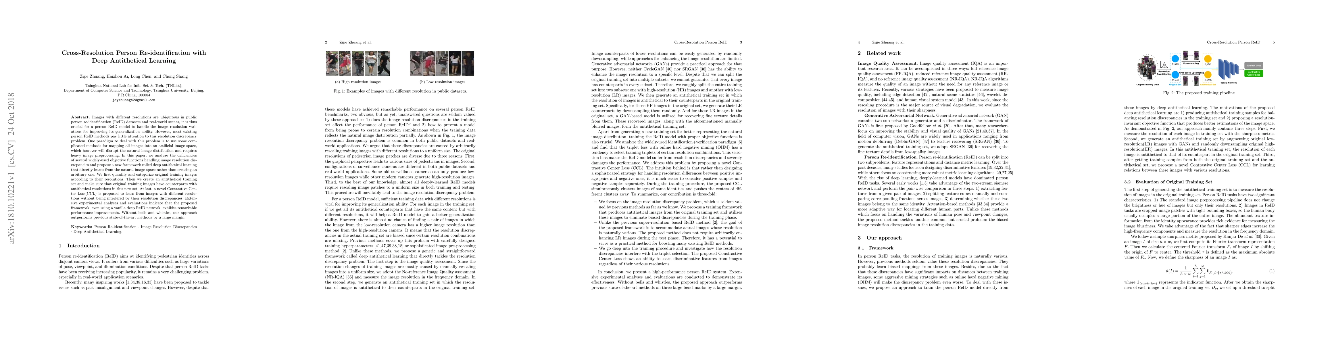 This paper proposes a novel deep antithetical learning framework to address resolution discrepancies in person re-identification (ReID) models. It introduces a Contrastive Center Loss (CCL) that learns directly from the natural image space, avoiding the need for artificial image transformations, and achieves significant performance improvements over previous methods.