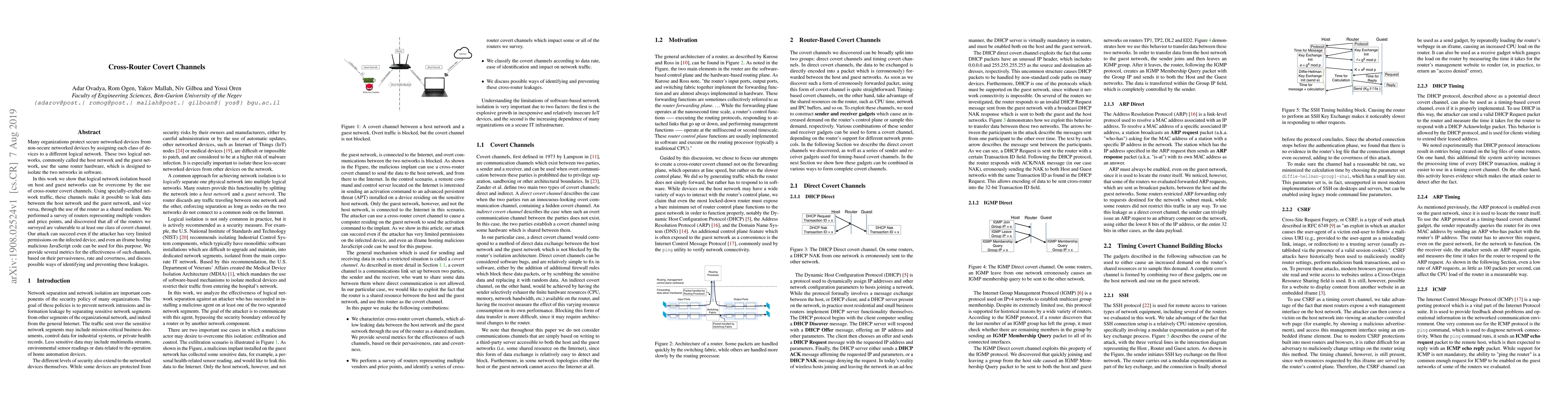 Many organizations protect secure networked devices from non-secure networked devices by assigning each class of devices to a different logical network. These two logical networks, commonly called the host network and the guest network, use the same router hardware, which is designed to isolate the two networks in software. In this work we show that logical network isolation based on host and guest networks can be overcome by the use of cross-router covert channels. Using specially-crafted network traffic, these channels make it possible to leak data between the host network and the guest network, and vice versa, through the use of the router as a shared medium. We performed a survey of routers representing multiple vendors and price points, and discovered that all of the routers we surveyed are vulnerable to at least one class of covert channel. Our attack can succeed even if the attacker has very limited permissions on the infected device, and even an iframe hosting malicious JavaScript code can be used for this purpose. We provide several metrics for the effectiveness of such channels, based on their pervasiveness, rate and covertness, and discuss possible ways of identifying and preventing these leakages.