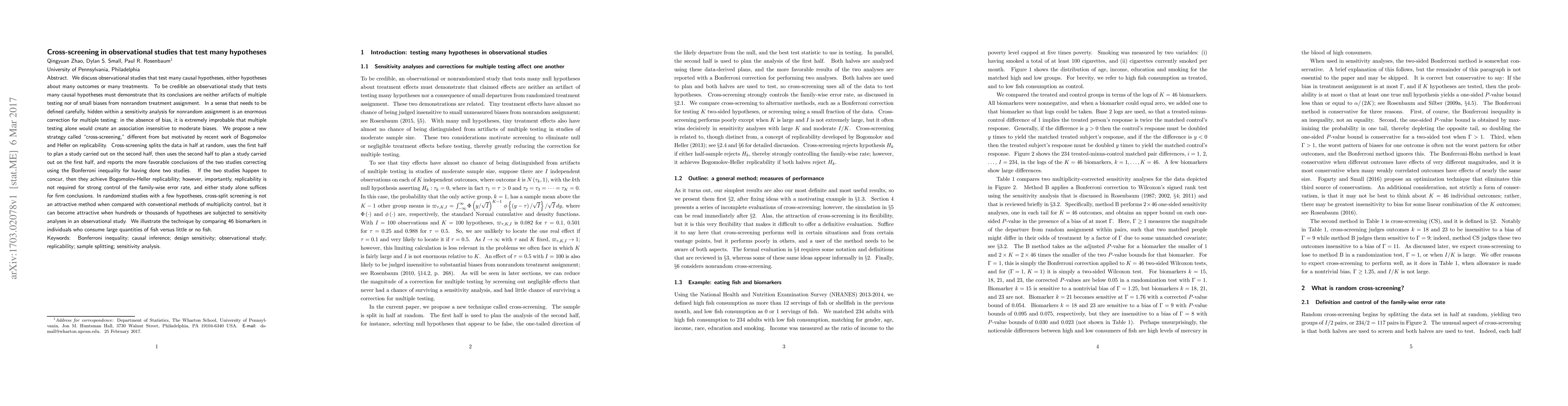 We discuss observational studies that test many causal hypotheses, either hypotheses about many outcomes or many treatments. To be credible an observational study that tests many causal hypotheses must demonstrate that its conclusions are neither artifacts of multiple testing nor of small biases from nonrandom treatment assignment. In a sense that needs to be defined carefully, hidden within a sensitivity analysis for nonrandom assignment is an enormous correction for multiple testing: in the absence of bias, it is extremely improbable that multiple testing alone would create an association insensitive to moderate biases. We propose a new strategy called "cross-screening", different from but motivated by recent work of Bogomolov and Heller on replicability. Cross-screening splits the data in half at random, uses the first half to plan a study carried out on the second half, then uses the second half to plan a study carried out on the first half, and reports the more favorable conclusions of the two studies correcting using the Bonferroni inequality for having done two studies. If the two studies happen to concur, then they achieve Bogomolov-Heller replicability; however, importantly, replicability is not required for strong control of the family-wise error rate, and either study alone suffices for firm conclusions. In randomized studies with a few hypotheses, cross-split screening is not an attractive method when compared with conventional methods of multiplicity control, but it can become attractive when hundreds or thousands of hypotheses are subjected to sensitivity analyses in an observational study. We illustrate the technique by comparing 46 biomarkers in individuals who consume large quantities of fish versus little or no fish.