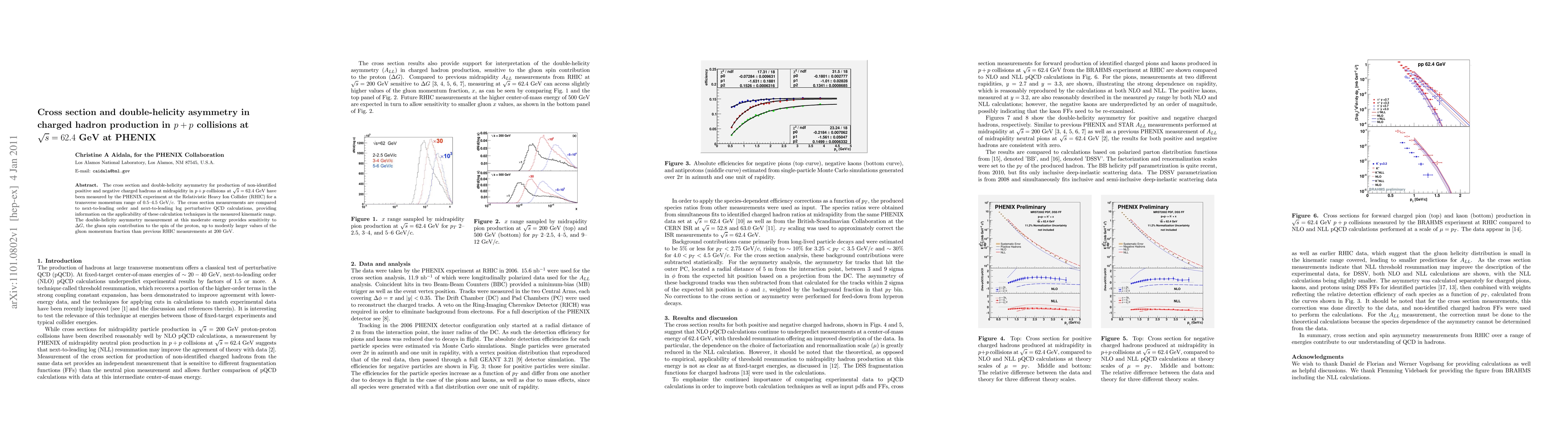 The PHENIX experiment measured the cross section and double-helicity asymmetry for charged hadron production in p+p collisions at sqrt(s) = 62.4 GeV, comparing results to perturbative QCD calculations and probing the gluon spin contribution to the proton's spin.