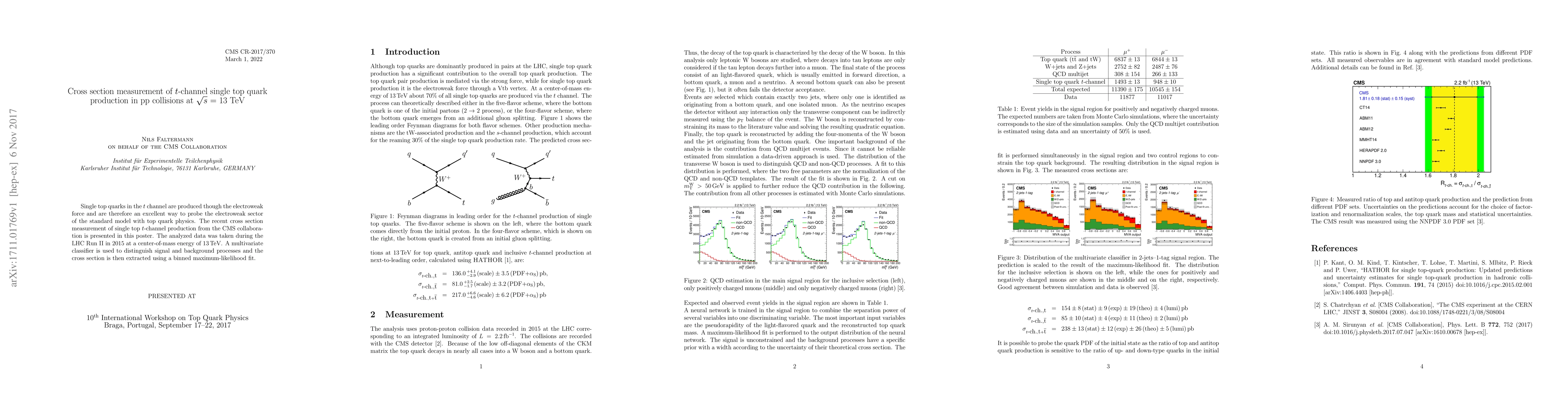 Single top quarks in the $t$ channel are produced though the electroweak force and are therefore an excellent way to probe the electroweak sector of the standard model with top quark physics. The recent cross section measurement of single top $t$-channel production from the CMS collaboration is presented in this poster. The analyzed data was taken during the LHC Run II in 2015 at a center-of-mass energy of $13\,\textrm{TeV}$. A multivariate classifier is used to distinguish signal and background processes and the cross section is then extracted using a binned maximum-likelihood fit.
