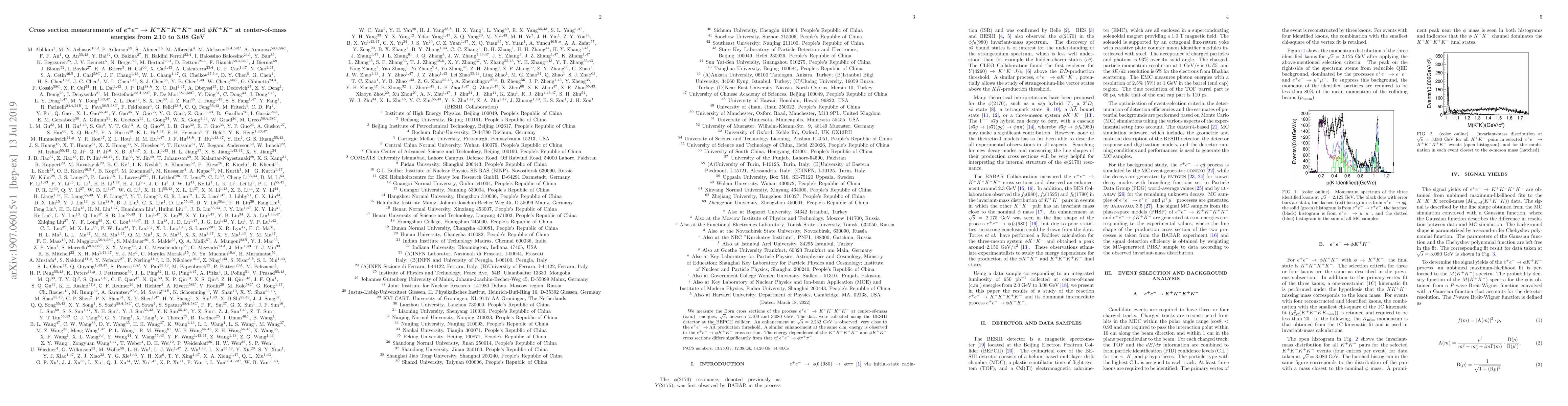 This paper reports on cross section measurements for $e^{+}e^{-} \to K^{+}K^{-}K^{+}K^{-}$ and $\phi K^{+}K^{-}$ at c.m. energies from 2.10 to 3.08 GeV, revealing enhancements near 2.232 GeV, suggesting new phenomena close to the $\Lambda \overline{\Lambda}$ production threshold. The observed energy dependence differs from that of $\phi \pi^{+}\pi^{-}$.