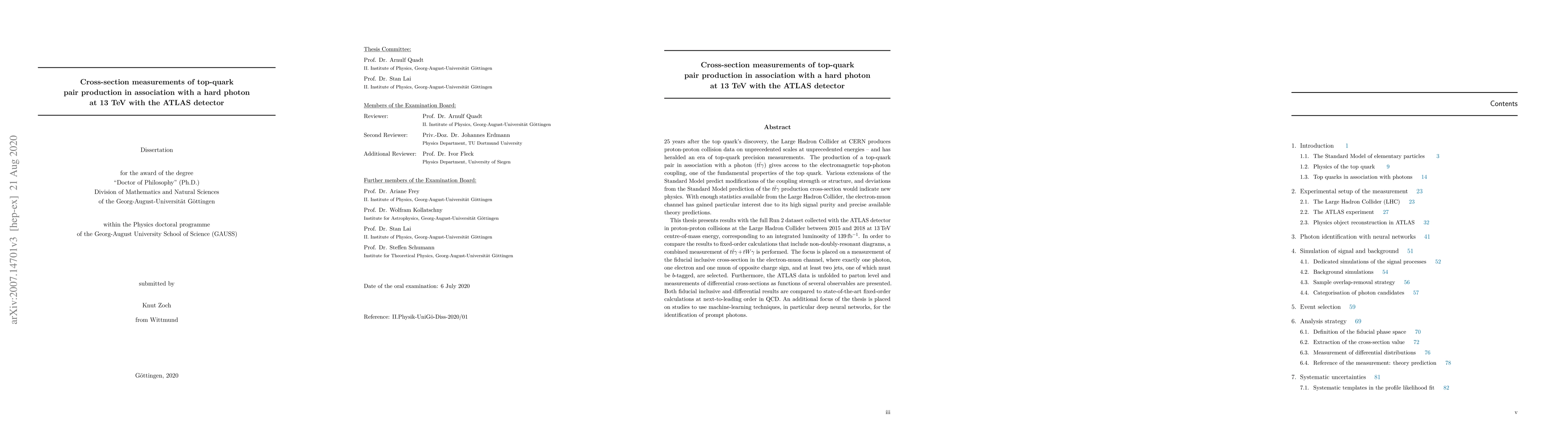 25 years after the top quark's discovery, the Large Hadron Collider at CERN produces proton-proton collision data on unprecedented scales at unprecedented energies - and has heralded an era of top-quark precision measurements. The production of a top-quark pair in association with a photon ($t\bar{t}\gamma$) gives access to the electromagnetic top-photon coupling, one of the fundamental properties of the top quark. Various extensions of the Standard Model predict modifications of the coupling strength or structure, and deviations from the Standard Model prediction of the $t\bar{t}\gamma$ production cross-section would indicate new physics. With enough statistics available from the Large Hadron Collider, the electron-muon channel has gained particular interest due to its high signal purity and precise available theory predictions. This thesis presents results with the full Run 2 dataset collected with the ATLAS detector in proton-proton collisions at the Large Hadron Collider between 2015 and 2018 at 13 TeV centre-of-mass energy, corresponding to an integrated luminosity of 139 fb$^{-1}$. In order to compare the results to fixed-order calculations that include non-doubly-resonant diagrams, a combined measurement of $t\bar{t}\gamma + tW\gamma$ is performed. The focus is placed on a measurement of the fiducial inclusive cross-section in the electron-muon channel. Furthermore, the ATLAS data is unfolded to parton level and measurements of differential cross-sections as functions of several observables are presented. Both fiducial inclusive and differential results are compared to state-of-the-art fixed-order calculations at next-to-leading order in QCD. An additional focus of the thesis is placed on studies to use machine-learning techniques, in particular deep neural networks, for the identification of prompt photons.