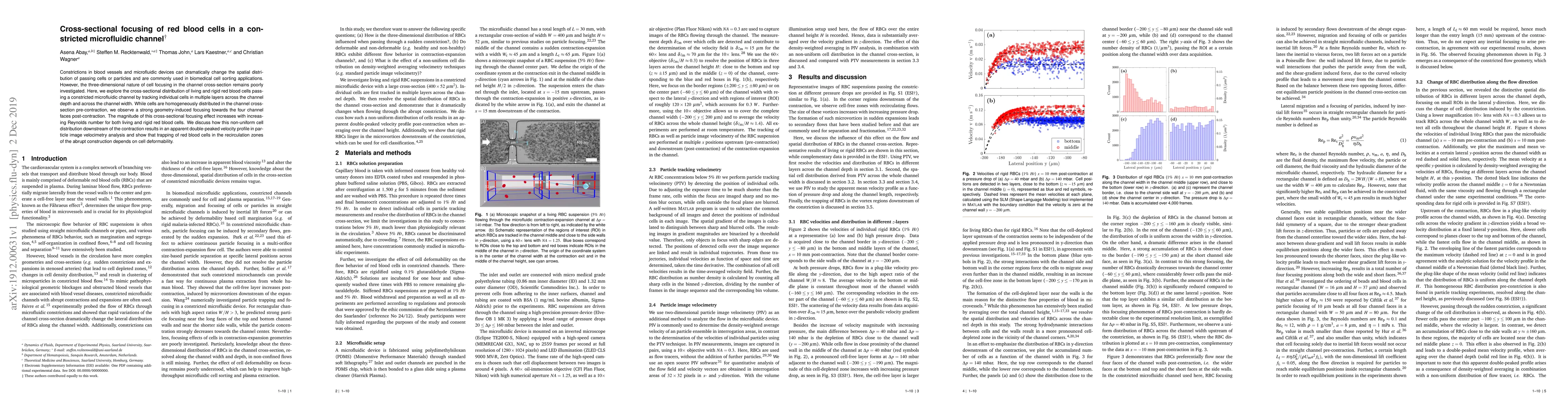This study investigates the three-dimensional focusing of red blood cells in a constricted microfluidic channel, revealing strong geometry-induced focusing towards the channel faces post-contraction, with the effect magnitude increasing with Reynolds number. The research also highlights the impact of cell deformability on trapping in the recirculation zones.