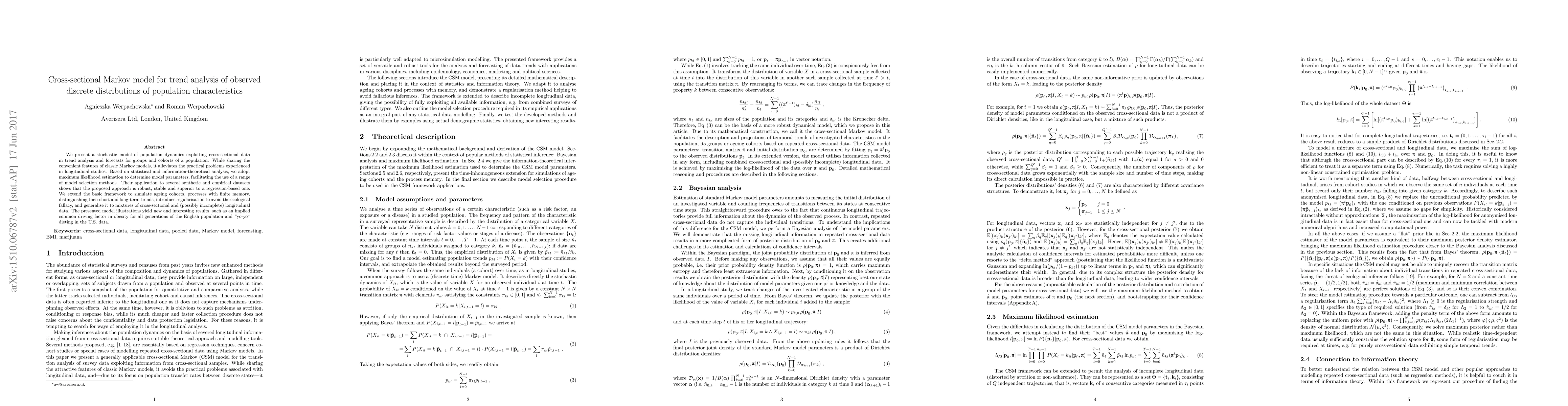 We present a stochastic model of population dynamics exploiting cross-sectional data in trend analysis and forecasts for groups and cohorts of a population. While sharing the convenient features of classic Markov models, it alleviates the practical problems experienced in longitudinal studies. Based on statistical and information-theoretical analysis, we adopt maximum likelihood estimation to determine model parameters, facilitating the use of a range of model selection methods. Their application to several synthetic and empirical datasets shows that the proposed approach is robust, stable and superior to a regression-based one. We extend the basic framework to simulate ageing cohorts, processes with finite memory, distinguishing their short and long-term trends, introduce regularisation to avoid the ecological fallacy, and generalise it to mixtures of cross-sectional and (possibly incomplete) longitudinal data. The presented model illustrations yield new and interesting results, such as an implied common driving factor in obesity for all generations of the English population and "yo-yo" dieting in the U.S. data.