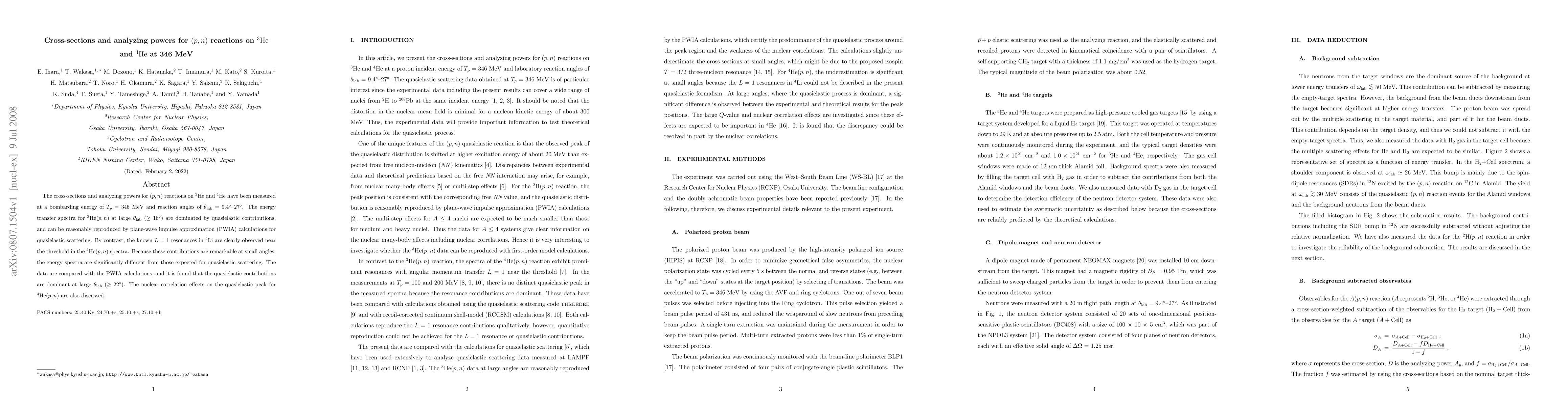 The cross-sections and analyzing powers for $(p,n)$ reactions on ${}^{3}{\rm He}$ and ${}^{4}{\rm He}$ have been measured at a bombarding energy of $T_p$ = 346 MeV and reaction angles of $\theta_{\rm lab}$ = $9.4^{\circ}$--$27^{\circ}$. The energy transfer spectra for ${}^{3}{\rm He}(p,n)$ at large $\theta_{\rm lab}$ ($\ge$ $16^{\circ}$) are dominated by quasielastic contributions, and can be reasonably reproduced by plane-wave impulse approximation (PWIA) calculations for quasielastic scattering. By contrast, the known $L$ = 1 resonances in ${}^{4}{\rm Li}$ are clearly observed near the threshold in the ${}^{4}{\rm He}(p,n)$ spectra. Because these contributions are remarkable at small angles, the energy spectra are significantly different from those expected for quasielastic scattering. The data are compared with the PWIA calculations, and it is found that the quasielastic contributions are dominant at large $\theta_{\rm lab}$ ($\ge$ $22^{\circ}$). The nuclear correlation effects on the quasielastic peak for ${}^{4}{\rm He}(p,n)$ are also discussed.