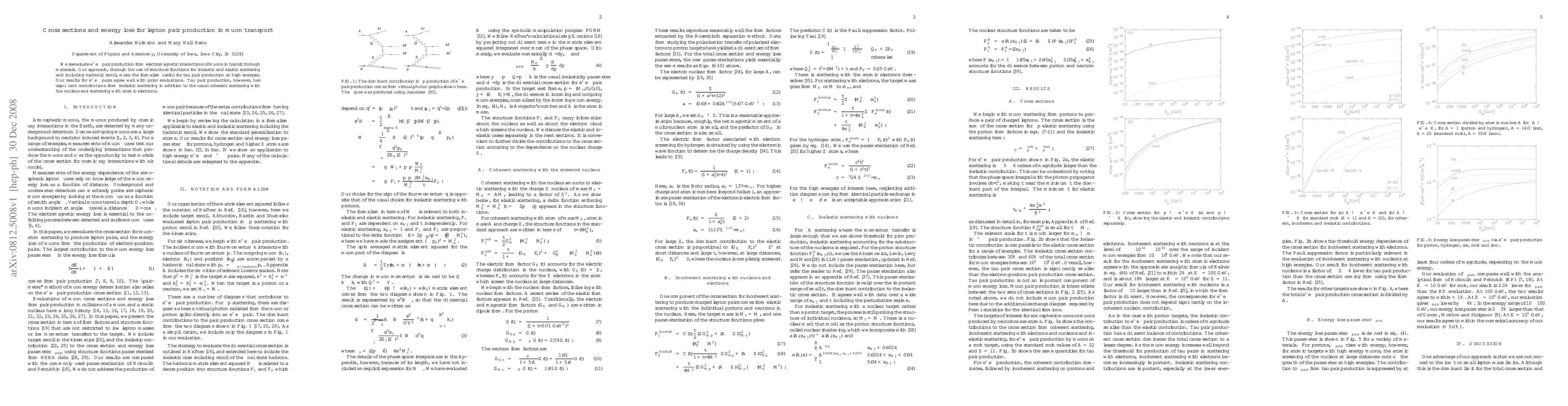 The research reevaluates electron-positron pair production from electromagnetic interactions of muons in transit through materials using structure functions for inelastic and elastic scattering, including hadronic recoil. This formalism is applicable for tau pair production at high energies.