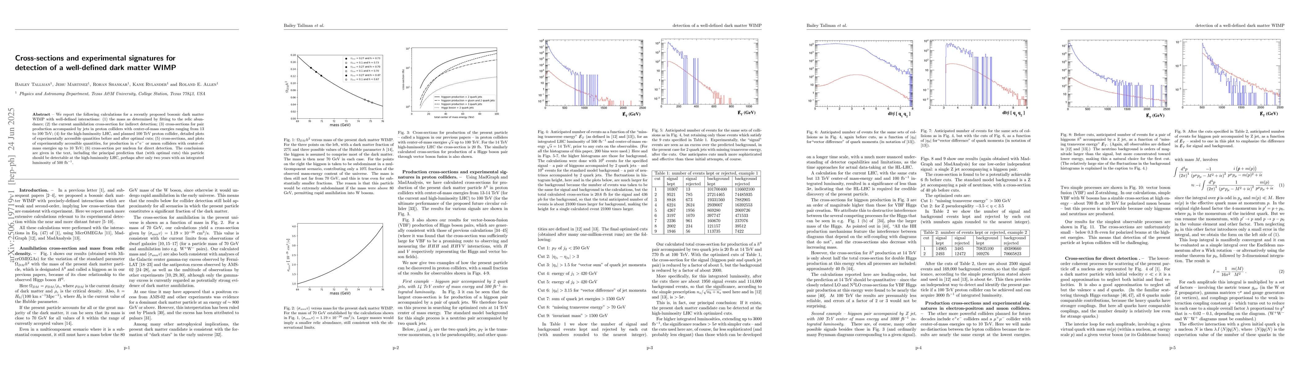 We report the following calculations for a recently proposed bosonic dark matter WIMP with well-defined interactions: (1)~the mass as determined by fitting to the relic abundance; (2)~the current annihilation cross-section for indirect detection; (3)~cross-sections for pair production accompanied by jets in proton colliders with center-of-mass energies ranging from 13 to 100 TeV; (4)~for the high-luminosity LHC, and planned 100 TeV proton collider, detailed plots of experimentally accessible quantities before and after optimal cuts; (5)~cross-sections, and plots of experimentally accessible quantities, for production in e$^+$e$^-$ or muon colliders with center-of-mass energies up to 10 TeV; (6)~cross-section per nucleon for direct detection. The conclusions are given in the text, including the principal prediction that (with optimal cuts) this particle should be detectable at the high-luminosity LHC, perhaps after only two years with an integrated luminosity of 500 fb$^{-1}$.