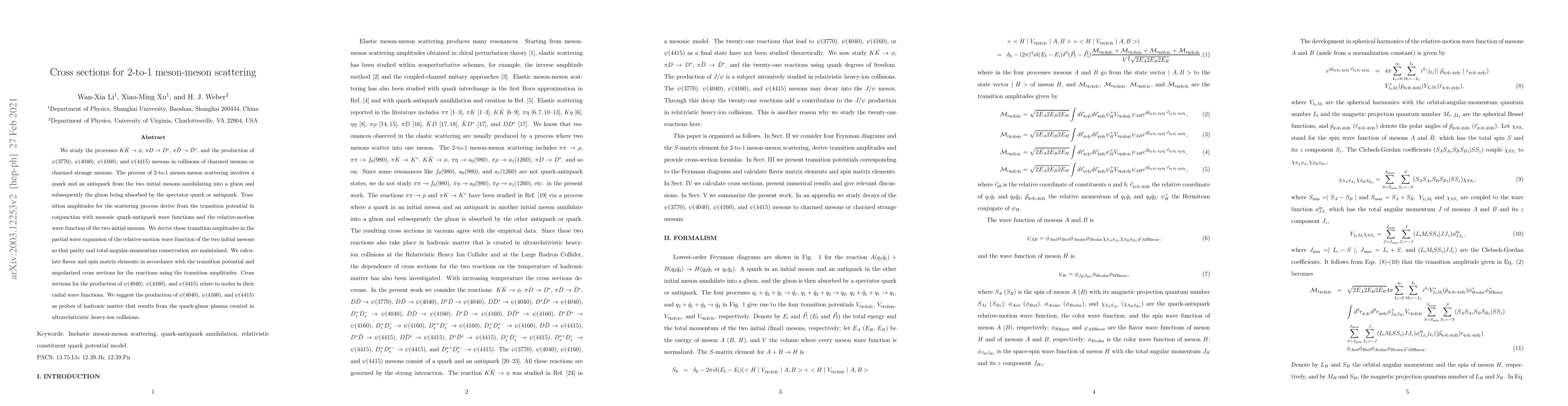 We study the processes $K\bar{K} \to \phi$, $\pi D \to D^\ast$, $\pi \bar{D} \to \bar{D}^\ast$, and the production of $\psi (3770)$, $\psi (4040)$, $\psi (4160)$, and $\psi (4415)$ mesons in collisions of charmed mesons or charmed strange mesons. The process of 2-to-1 meson-meson scattering involves a quark and an antiquark from the two initial mesons annihilating into a gluon and subsequently the gluon being absorbed by the spectator quark or antiquark. Transition amplitudes for the scattering process derive from the transition potential in conjunction with mesonic quark-antiquark wave functions and the relative-motion wave function of the two initial mesons. We derive these transition amplitudes in the partial wave expansion of the relative-motion wave function of the two initial mesons so that parity and total-angular-momentum conservation are maintained. We calculate flavor and spin matrix elements in accordance with the transition potential and unpolarized cross sections for the reactions using the transition amplitudes. Cross sections for the production of $\psi (4040)$, $\psi (4160)$, and $\psi (4415)$ relate to nodes in their radial wave functions. We suggest the production of $\psi (4040)$, $\psi (4160)$, and $\psi (4415)$ as probes of hadronic matter that results from the quark-gluon plasma created in ultrarelativistic heavy-ion collisions.