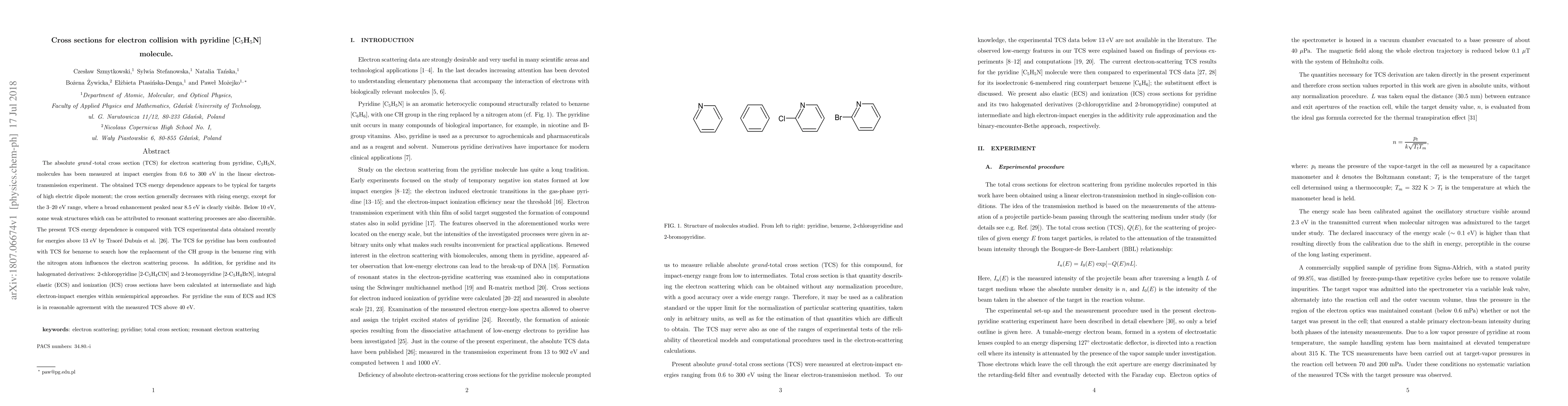 The absolute grand-total cross section (TCS) for electron scattering from pyridine, C$_{5}$H$_{5}$N, molecules has been measured at impact energies from 0.6 to 300 eV in the linear electron-transmission experiment. The obtained TCS energy dependence appears to be typical for targets of high electric dipole moment; the cross section generally decreases with rising energy, except for the 3-20 eV range, where a broad enhancement peaked near 8.5 eV is clearly visible. Below 10 eV, some weak structures which can be attributed to resonant scattering processes are also discernible. The present TCS energy dependence is compared with TCS experimental data obtained recently for energies above 13 eV by Traore Dubuis et al. [26]. The TCS for pyridine has been confronted with TCS for benzene to search how the replacement of the CH group in the benzene ring with the nitrogen atom influences the electron scattering process. In addition, for pyridine and its halogenated derivatives: 2-chloropyridine [2-C$_{5}$H$_{4}$ClN] and 2-bromopyridine [2-C$_{5}$H$_{4}$BrN], integral elastic (ECS) and ionization (ICS) cross sections have been calculated at intermediate and high electron-impact energies within semiempirical approaches. For pyridine the sum of ECS and ICS is in reasonable agreement with the measured TCS above 40 eV.