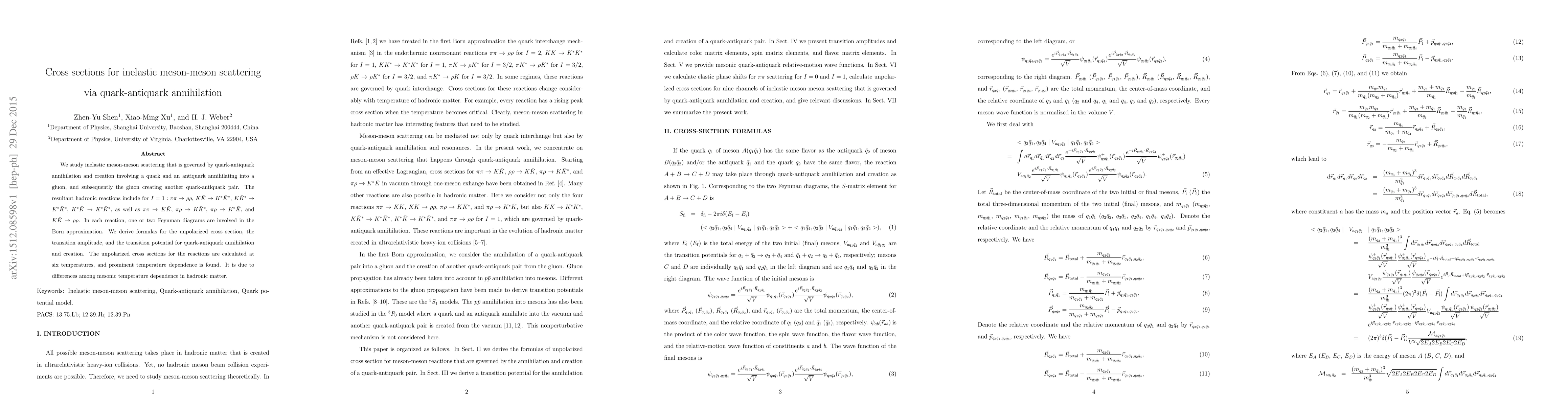 This paper investigates inelastic meson-meson scattering processes driven by quark-antiquark annihilation and creation, deriving formulas for cross sections, transition amplitudes, and potentials. The study finds significant temperature dependence in the calculated cross sections due to varying mesonic temperature effects in hadronic matter.