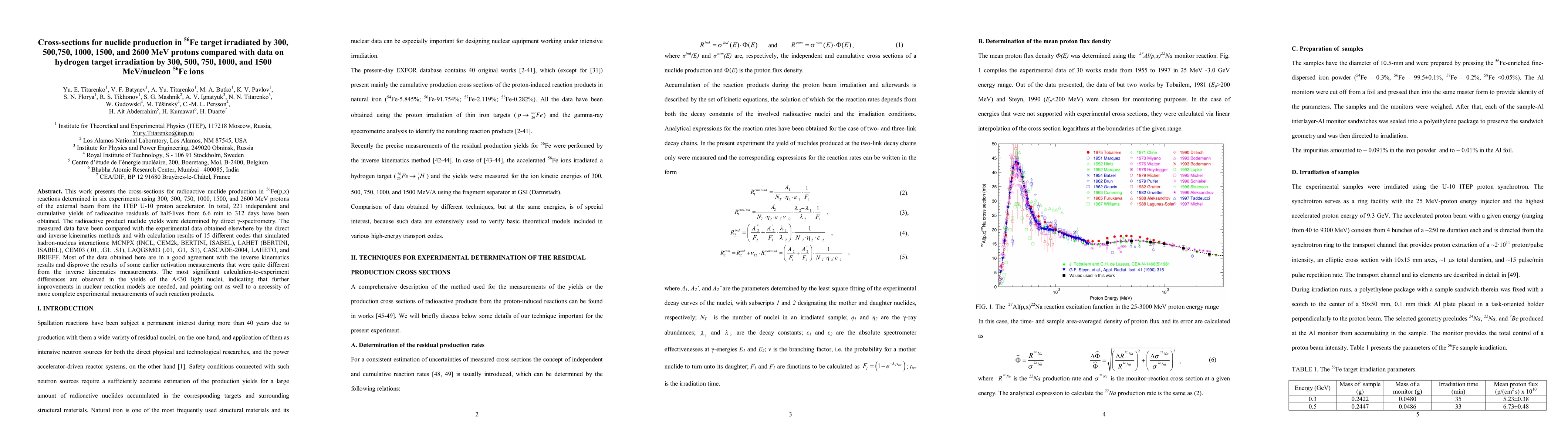 Cross-sections for radioactive nuclide production in 56Fe(p,x) reactions at 300, 500, 750, 1000, 1500, and 2600 MeV were measured using the ITEP U-10 proton accelerator. In total, 221 independent and cumulative yields of products of half-lives from 6.6 min to 312 days have been obtained via the direct-spectrometry method. The measured data have been compared with the experimental data obtained elsewhere by the direct and inverse kinematics methods and with calculations by 15 codes, namely: MCNPX (INCL, CEM2k, BERTINI, ISABEL), LAHET (BERTINI, ISABEL), CEM03 (.01, .G1, .S1), LAQGSM03 (.01, .G1, >.S1), CASCADE-2004, LAHETO, and BRIEFF. Most of our data are in a good agreement with the inverse kinematics results and disprove the results of some earlier activation measurements that were quite different from the inverse kinematics measurements. The most significant calculation-to-experiment differences are observed in the yields of the A<30 light nuclei, indicating that further improvements in nuclear reaction models are needed, and pointing out as well to a necessity of more complete measurements of such reactions.