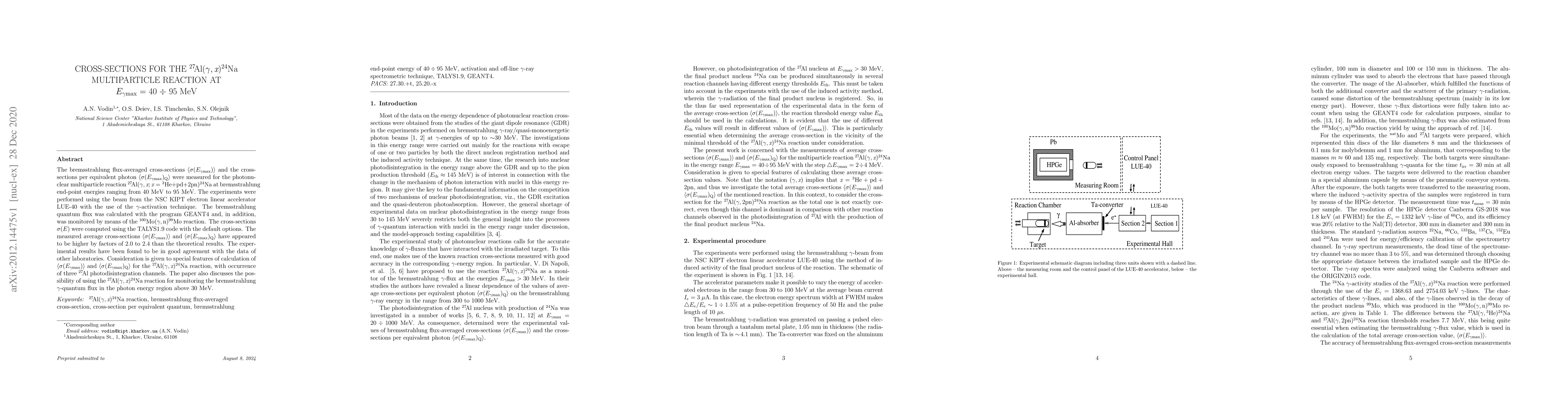 The bremsstrahlung flux-averaged cross-sections $\langle{\sigma(E_{\rm{\gamma max}})}\rangle$ and the cross-sections per equivalent photon $\langle{\sigma(E_{\rm{\gamma max}})_{\rm{Q}}}\rangle$ were measured for the photonuclear multiparticle reaction $^{27}\!\rm{Al}(\gamma,\textit{x}; \textit{x} = {^{3}\rm{He}} + pd + 2pn)^{24}\rm{Na}$ at bremsstrahlung end-point energies ranging from 40 MeV to 95 MeV. The experiments were performed using the beam from the NSC KIPT electron linear accelerator LUE-40 with the use of the $\gamma$-activation technique. The bremsstrahlung quantum flux was calculated with the program GEANT4 and, in addition, was monitored by means of the $^{100}\rm{Mo}(\gamma,n)^{99}\rm{Mo}$ reaction. The cross-sections $\sigma(E)$ were computed using the TALYS1.9 code with the default options. The measured average cross-sections $\langle{\sigma(E_{\rm{\gamma max}})}\rangle$ and $\langle{\sigma(E_{\rm{\gamma max}})_{\rm{Q}}}\rangle$ have appeared to be higher by factors of 2.0 to 2.4 than the theoretical results. The experimental results have been found to be in good agreement with the data of other laboratories. Consideration is given to special features of calculation of $\langle{\sigma(E_{\rm{\gamma max}})}\rangle$ and $\langle{\sigma(E_{\rm{\gamma max}})_{\rm{Q}}}\rangle$ for the $^{27}\!\rm{Al}(\gamma,\textit{x})^{24}\rm{Na}$ reaction, with occurrence of three $^{27}\!\rm{Al}$ photodisintegration channels. The paper also discusses the possibility of using the $^{27}\!\rm{Al}(\gamma,\textit{x})^{24}\rm{Na}$ reaction for monitoring the bremsstrahlung $\gamma$-quantum flux in the photon energy region above 30 MeV.