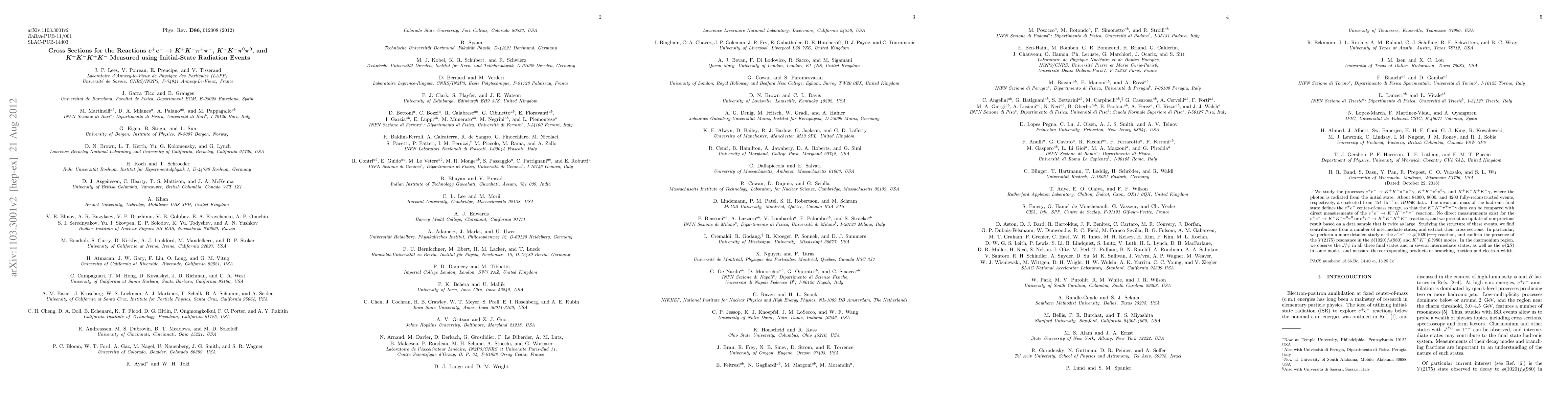 Detailed analysis of e+e- annihilation into multi-meson final states using ISR events, with precise reconstruction of all final-state particles and identification of various intermediate resonances.