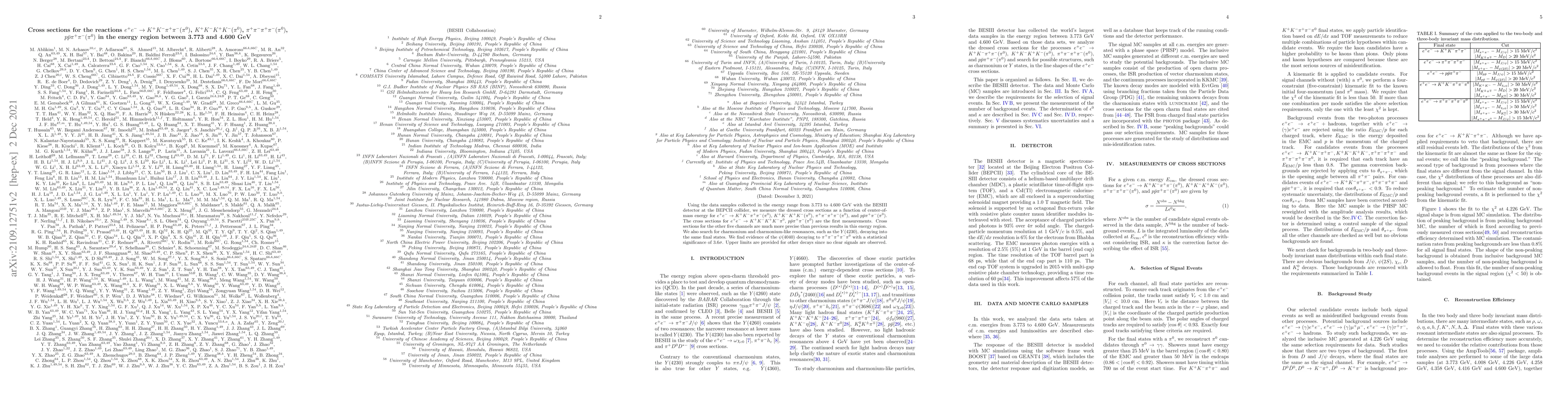 Using the data samples collected in the energy range from 3.773 to 4.600 GeV with the BESIII detector at the BEPCII collider, we measure the dressed cross sections as a function of center-of-mass energy for $e^+e^-\rightarrow K^+K^-\pi^+\pi^-(\pi^0)$, $K^+K^-K^+K^-(\pi^0)$, $\pi^+\pi^-\pi^+\pi^-(\pi^0)$, and $p\bar{p}\pi^+\pi^-(\pi^0)$. The cross sections for $e^+e^-\rightarrow K^+K^-K^+K^-\pi^0$, $p\bar{p}\pi^+\pi^-(\pi^0)$ are the first measurements. Cross sections for the other five channels are much more precise than previous results in this energy region. We also search for charmonium and charmonium-like resonances, such as the $Y(4230)$, decaying into the same final states. We find evidence of the $\psi(4040)$ decaying to $\pi^+\pi^-\pi^+\pi^-\pi^0$ with a statistical significance of $3.6\sigma$. Upper limits are provided for other decays since no clear signals are observed.