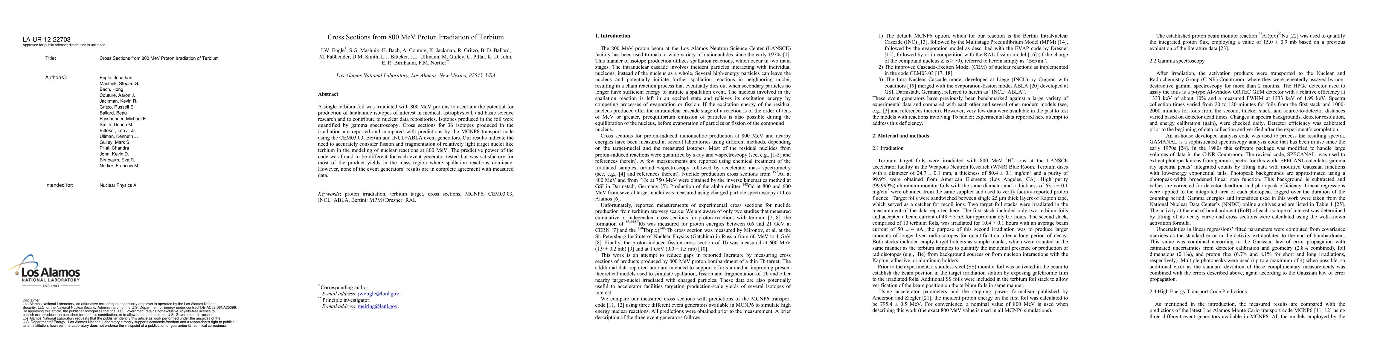 A single terbium foil was irradiated with 800 MeV protons to ascertain the potential for production of lanthanide isotopes of interest in medical, astrophysical, and basic science research and to contribute to nuclear data repositories. Isotopes produced in the foil were quantified by gamma spectroscopy. Cross sections for 36 isotopes produced in the irradiation are reported and compared with predictions by the MCNP6 transport code using the CEM03.03, Bertini, and INCL+ABLA event generators. Our results indicate the need to accurately consider fission and fragmentation of relatively light target nuclei like terbium in the modeling of nuclear reactions at 800 MeV. The predictive power of the code was found to be different for each event generator tested but was satisfactory for most of the product yields in the mass region where spallation reactions dominate. However, none of the event generators' results are in complete agreement with measured data.