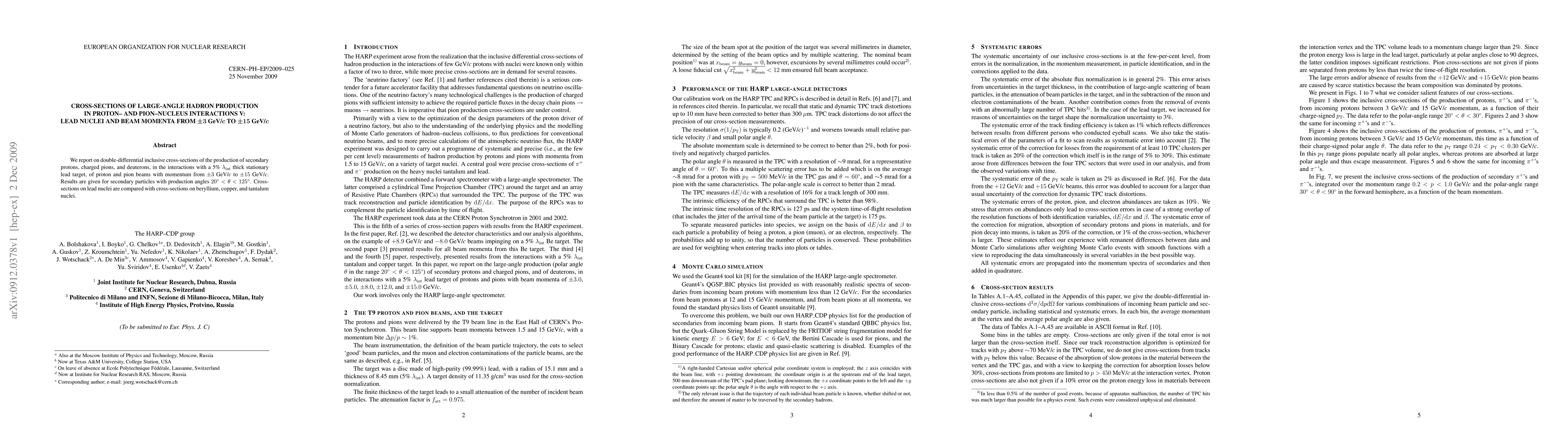 We report on double-differential inclusive cross-sections of the production of secondary protons, charged pions, and deuterons, in the interactions with a 5% nuclear interaction length thick stationary lead target, of proton and pion beams with momentum from +/-3 GeV/c to +/-15 GeV/c. Results are given for secondary particles with production angles 20 to 125 degrees. Cross-sections on lead nuclei are compared with cross-sections on beryllium, copper, and tantalum nuclei.