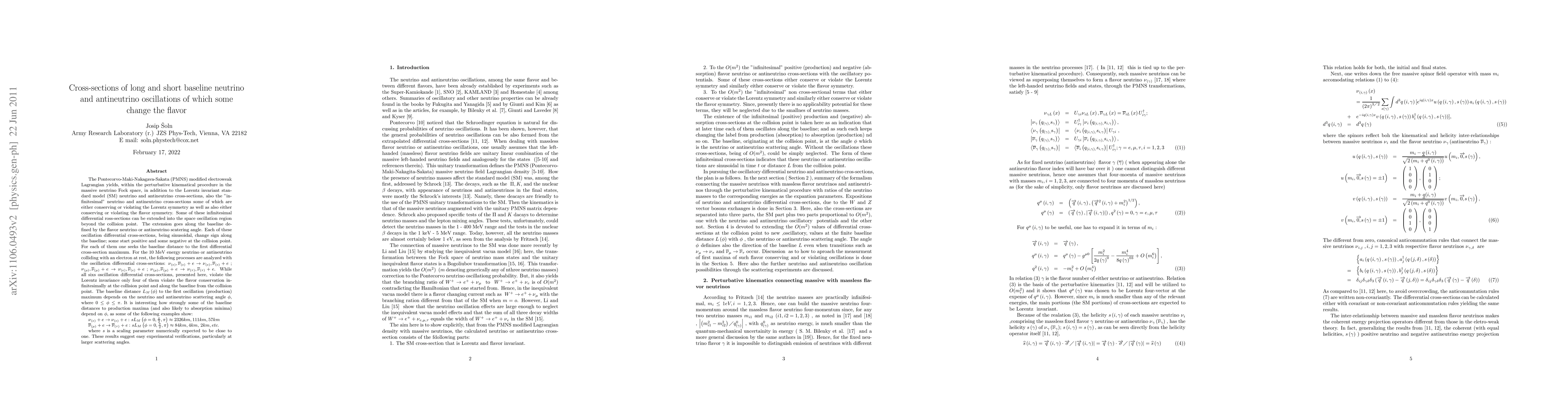 The Pontecorvo-Maki-Nakagava-Sakata (PMNS) modified electroweak Lagrangian yields, within the perturbative kinematical procedure in the massive neutrino Fock space, in addition to the Lorentz invariant standard model (SM) neutrino and antineutrino cross-sections, also the "infinitesimal" neutrino and antineutrino cross-sections some of which are either conserving or violating the Lorentz symmetry as well as also either conserving or violating the flavor symmetry. Some of these infinitesimal differential cross-sections can be extended into the space oscillation region beyond the collision point. The extension goes along the baseline defined by the flavor neutrino or antineutrino scattering angle. Each of these oscillation differential cross-sections, being sinusoidal, change sign along the baseline; some start positive and some negative at the collision point. For each of them one seeks the baseline distance to the first differential cross-section maximum.