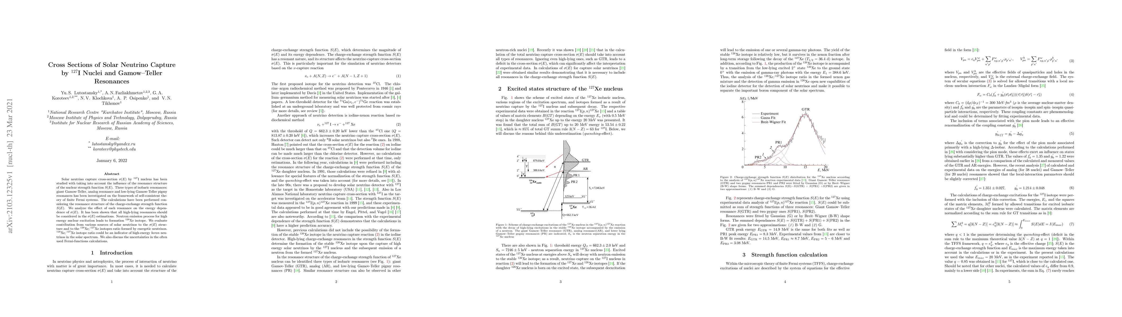 Solar neutrino capture cross-section by 127I nucleus has been studied with taking into account the influence of the resonance structure of the nuclear strength function S(E). Three types of isobaric resonances: giant Gamow-Teller, analog resonance and low-lying Gamow-Teller pigmy resonances has been investigated on the framework of self-consistent theory of finite Fermi systems. The calculations have been performed considering the resonance structure of the charge-exchange strength function S(E). We analyze the effect of each resonance on the energy dependence of the cross-section. It has been shown that all high-lying resonances should be considered. Neutron emission process for high energy nuclear excitation leads to formation 126Xe isotope. We evaluate contribution from various sources of solar neutrinos to the 126Xe/127Xe isotopes ratio formed by energetic neutrinos. 126Xe/127Xe isotope ratio could be an indicator of high-energy boron neutrinos in the solar spectrum. We also discuss the uncertainties in the often used Fermi-functions calculations.