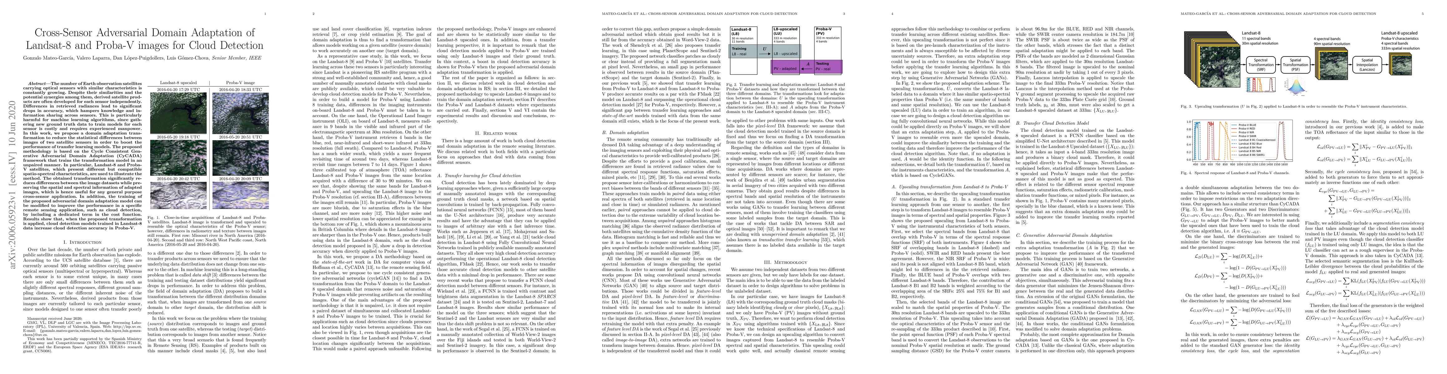 This paper proposes a Cycle Consistent Generative Adversarial Domain Adaptation (CyCADA) framework to reduce differences between Landsat-8 and Proba-V satellite images, enhancing transfer learning performance. The method improves cloud detection accuracy by adapting Landsat-8 models to Proba-V data, demonstrating the potential for cross-sensor synergy in remote sensing applications.