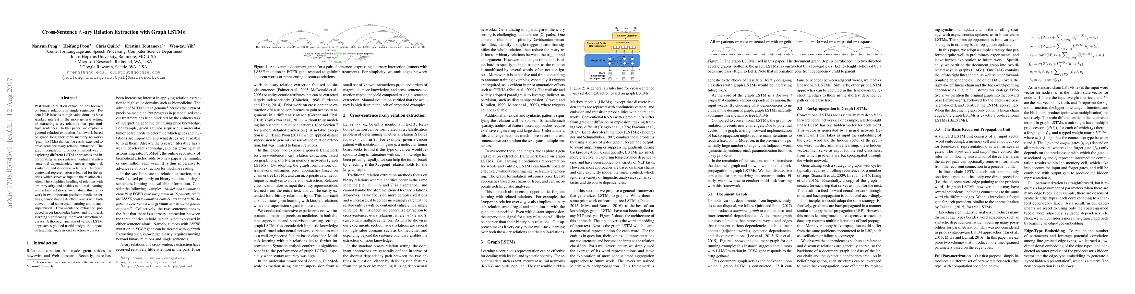 This paper proposes a graph LSTM framework for cross-sentence n-ary relation extraction, demonstrating its effectiveness in precision medicine settings. The approach incorporates various dependencies and enhances extraction accuracy through multi-task learning.