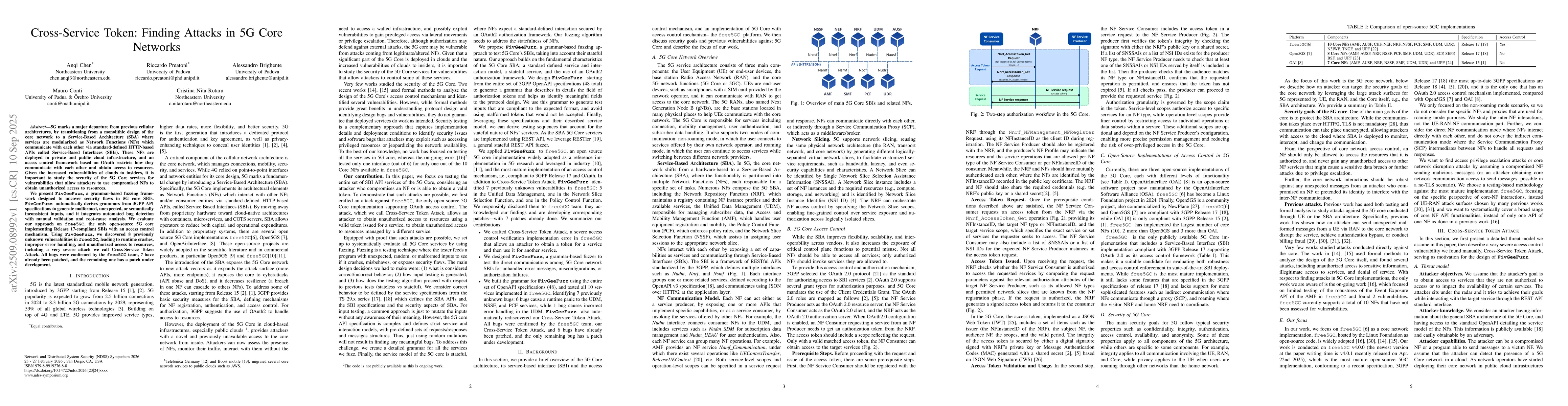 5G marks a major departure from previous cellular architectures, by transitioning from a monolithic design of the core network to a Service-Based Architecture (SBA) where services are modularized as Network Functions (NFs) which communicate with each other via standard-defined HTTP-based APIs called Service-Based Interfaces (SBIs). These NFs are deployed in private and public cloud infrastructure, and an access control framework based on OAuth restricts how they communicate with each other and obtain access to resources. Given the increased vulnerabilities of clouds to insiders, it is important to study the security of the 5G Core services for vulnerabilities that allow attackers to use compromised NFs to obtain unauthorized access to resources. We present FivGeeFuzz, a grammar-based fuzzing framework designed to uncover security flaws in 5G core SBIs. FivGeeFuzz automatically derives grammars from 3GPP API specifications to generate malformed, unexpected, or semantically inconsistent inputs, and it integrates automated bug detection with manual validation and root-cause analysis. We evaluate our approach on free5GC, the only open-source 5G core implementing Release 17-compliant SBIs with an access control mechanism. Using FivGeeFuzz, we discovered 8 previously unknown vulnerabilities in free5GC, leading to runtime crashes, improper error handling, and unauthorized access to resources, including a very severe attack we call Cross-Service Token Attack. All bugs were confirmed by the free5GC team, 7 have already been patched, and the remaining one has a patch under development.