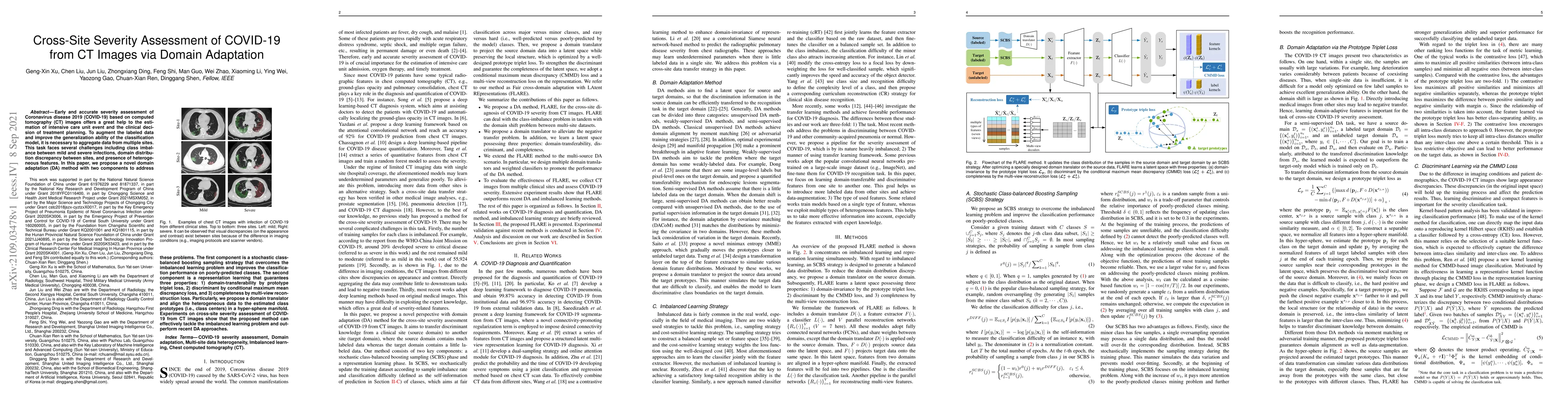 This research introduces a novel domain adaptation method for cross-site severity assessment of COVID-19 from CT images, addressing class imbalance and domain distribution discrepancy through stochastic class-balanced boosting sampling and representation learning with prototype triplet, conditional maximum mean discrepancy, and multi-view reconstruction losses. The proposed method outperforms recent approaches in experiments.