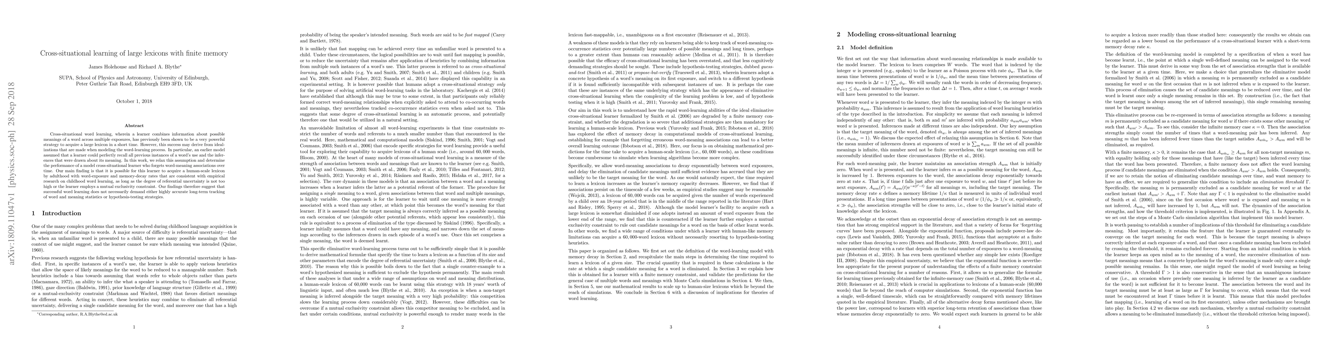 This paper explores how a cross-situational learner can acquire a large lexicon despite limited memory by forgetting word-meaning associations over time. The study finds that such a learner can still achieve human-scale vocabulary growth if referential uncertainty is moderate and mutual exclusivity is employed.