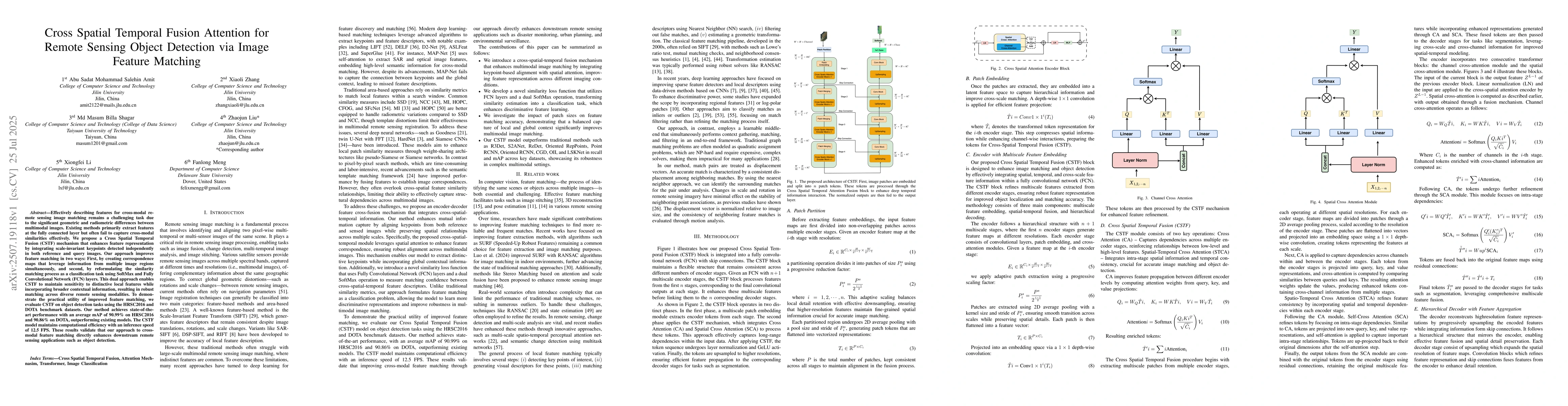 Effectively describing features for cross-modal remote sensing image matching remains a challenging task due to the significant geometric and radiometric differences between multimodal images. Existing methods primarily extract features at the fully connected layer but often fail to capture cross-modal similarities effectively. We propose a Cross Spatial Temporal Fusion (CSTF) mechanism that enhances feature representation by integrating scale-invariant keypoints detected independently in both reference and query images. Our approach improves feature matching in two ways: First, by creating correspondence maps that leverage information from multiple image regions simultaneously, and second, by reformulating the similarity matching process as a classification task using SoftMax and Fully Convolutional Network (FCN) layers. This dual approach enables CSTF to maintain sensitivity to distinctive local features while incorporating broader contextual information, resulting in robust matching across diverse remote sensing modalities. To demonstrate the practical utility of improved feature matching, we evaluate CSTF on object detection tasks using the HRSC2016 and DOTA benchmark datasets. Our method achieves state-of-theart performance with an average mAP of 90.99% on HRSC2016 and 90.86% on DOTA, outperforming existing models. The CSTF model maintains computational efficiency with an inference speed of 12.5 FPS. These results validate that our approach to crossmodal feature matching directly enhances downstream remote sensing applications such as object detection.