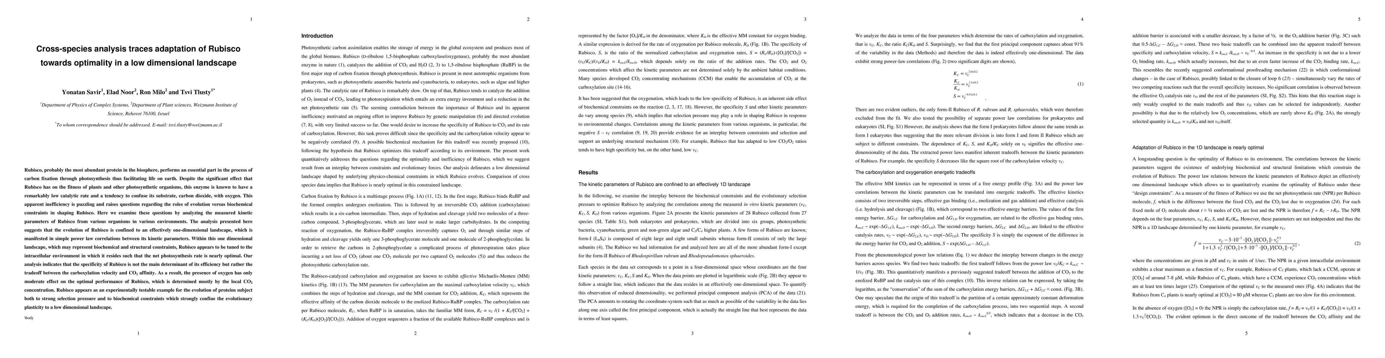 Rubisco, probably the most abundant protein in the biosphere, performs an essential part in the process of carbon fixation through photosynthesis thus facilitating life on earth. Despite the significant effect that Rubisco has on the fitness of plants and other photosynthetic organisms, this enzyme is known to have a remarkably low catalytic rate and a tendency to confuse its substrate, carbon dioxide, with oxygen. This apparent inefficiency is puzzling and raises questions regarding the roles of evolution versus biochemical constraints in shaping Rubisco. Here we examine these questions by analyzing the measured kinetic parameters of Rubisco from various organisms in various environments. The analysis presented here suggests that the evolution of Rubisco is confined to an effectively one-dimensional landscape, which is manifested in simple power law correlations between its kinetic parameters. Within this one dimensional landscape, which may represent biochemical and structural constraints, Rubisco appears to be tuned to the intracellular environment in which it resides such that the net photosynthesis rate is nearly optimal. Our analysis indicates that the specificity of Rubisco is not the main determinant of its efficiency but rather the tradeoff between the carboxylation velocity and CO2 affinity. As a result, the presence of oxygen has only moderate effect on the optimal performance of Rubisco, which is determined mostly by the local CO2 concentration. Rubisco appears as an experimentally testable example for the evolution of proteins subject both to strong selection pressure and to biochemical constraints which strongly confine the evolutionary plasticity to a low dimensional landscape.