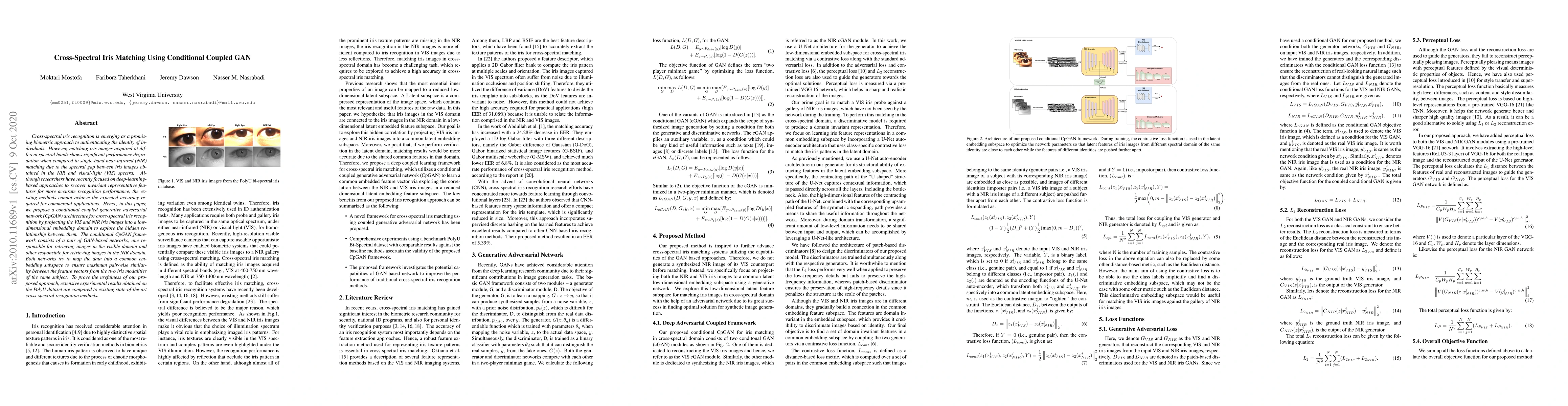 This paper proposes a conditional coupled GAN (CpGAN) architecture to enhance cross-spectral iris recognition by mapping visible and NIR iris images into a common embedding space, aiming to bridge the spectral gap and improve matching accuracy. Experimental results on the PolyU dataset demonstrate the effectiveness of the proposed method over existing state-of-the-art techniques.