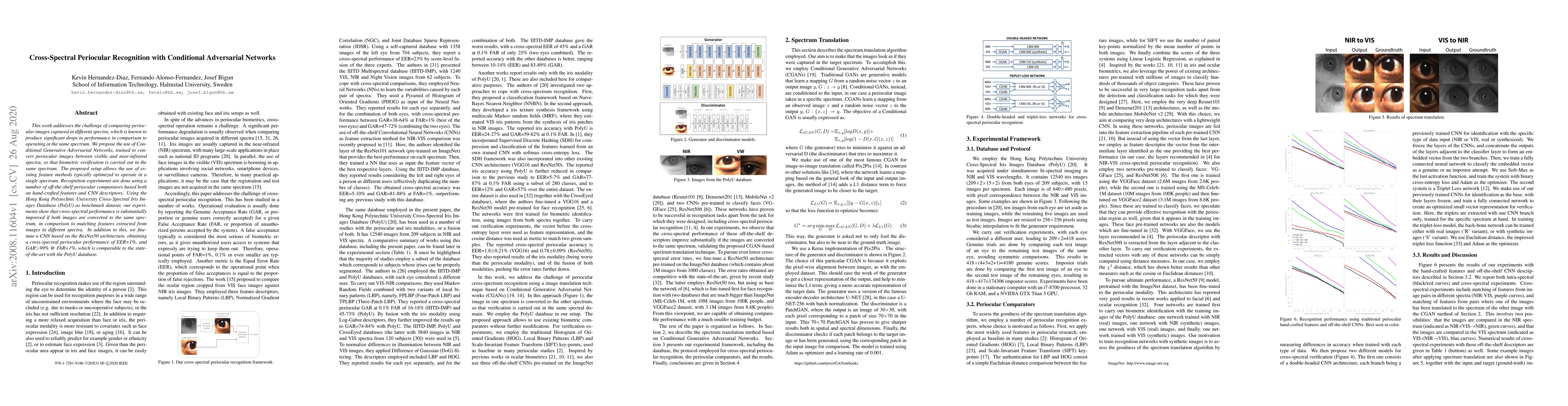 This research proposes a method using Conditional Generative Adversarial Networks to convert periocular images between visible and near-infrared spectra, enhancing cross-spectral recognition performance. The approach allows existing feature methods to operate effectively across different spectra, achieving state-of-the-art results with an Equal Error Rate (EER) of 1% and a Genuine Acceptance Rate (GAR) of over 99% at a False Acceptance Rate (FAR) of 1%.