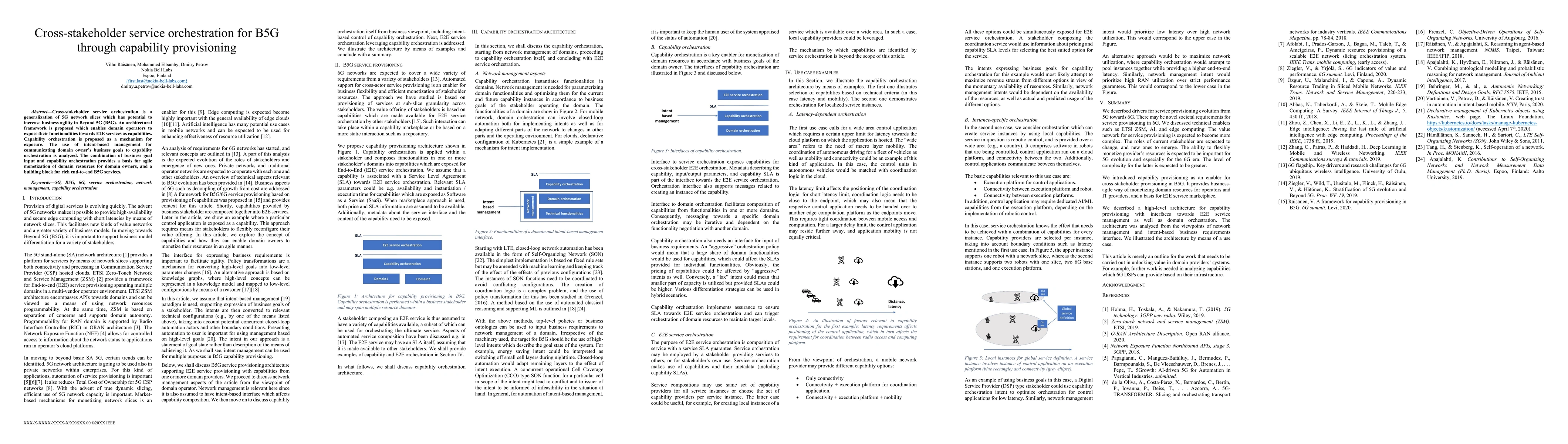 Cross-stakeholder service orchestration is a generalization of 5G network slices which has potential to increase business agility in Beyond 5G (B5G). An architectural framework is proposed which enables domain operators to expose their functionalities towards E2E services as capabilities. Capability orchestration is proposed as a mechanism for exposure. The use of intent-based management for communicating domain owner's business goals to capability orchestration is analyzed. The combination of business goal input and capability orchestration provides a basis for agile monetization of domain resources for domain owners, and a building block for rich end-to-end B5G services.
