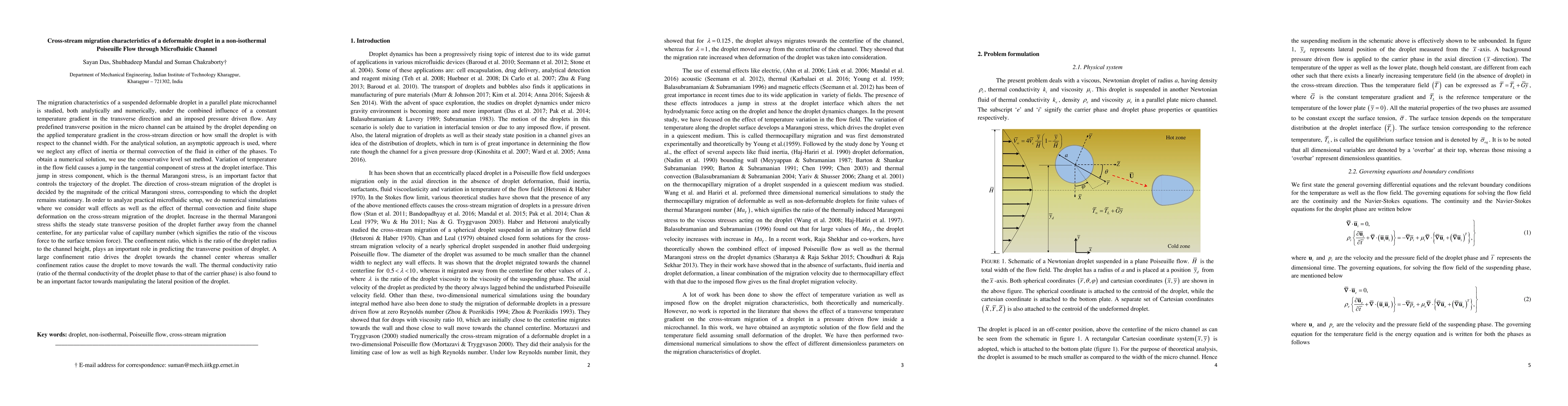 The migration characteristics of a suspended deformable droplet in a parallel plate microchannel is studied, both analytically and numerically, under the combined influence of a constant temperature gradient in the transverse direction and an imposed pressure driven flow. Any predefined transverse position in the micro channel can be attained by the droplet depending on the applied temperature gradient in the cross-stream direction or how small the droplet is with respect to the channel width. For the analytical solution, an asymptotic approach is used, where we neglect any effect of inertia or thermal convection of the fluid in either of the phases. To obtain a numerical solution, we use the conservative level set method. Variation of temperature in the flow field causes a jump in the tangential component of stress at the droplet interface. This jump in stress component, which is the thermal Marangoni stress, is an important factor that controls the trajectory of the droplet. The direction of cross-stream migration of the droplet is decided by the magnitude of the critical Marangoni stress, corresponding to which the droplet remains stationary. In order to analyze practical microfluidic setup, we do numerical simulations where we consider wall effects as well as the effect of thermal convection and finite shape deformation on the cross-stream migration of the droplet.