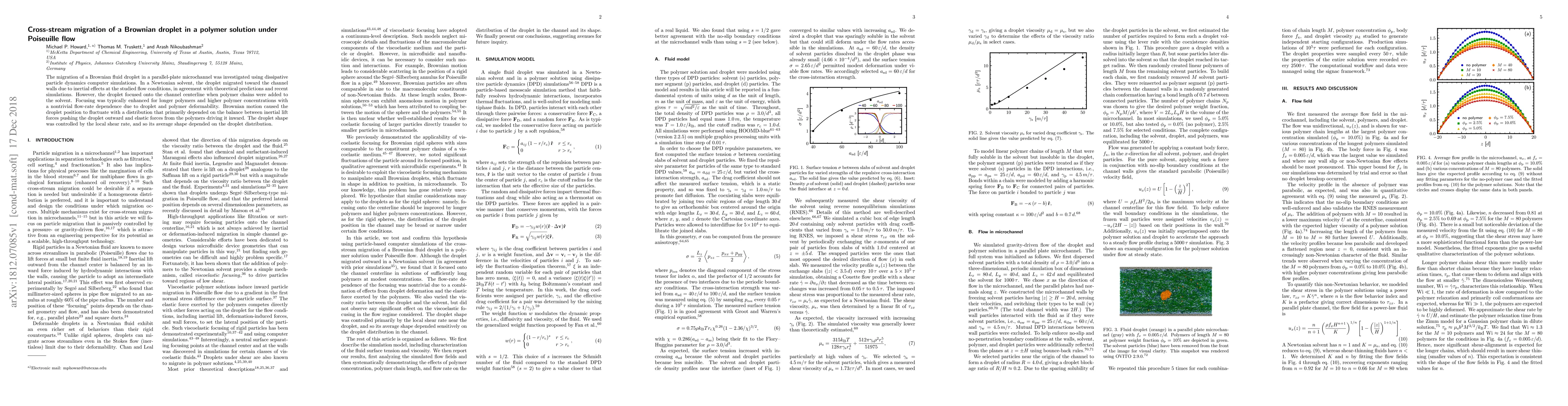 The study provides insights into the cross-stream migration of Brownian droplets in polymer solutions under Poiseuille flow, highlighting the role of polymer deformability, droplet deformability, and Brownian motion in droplet position distribution.