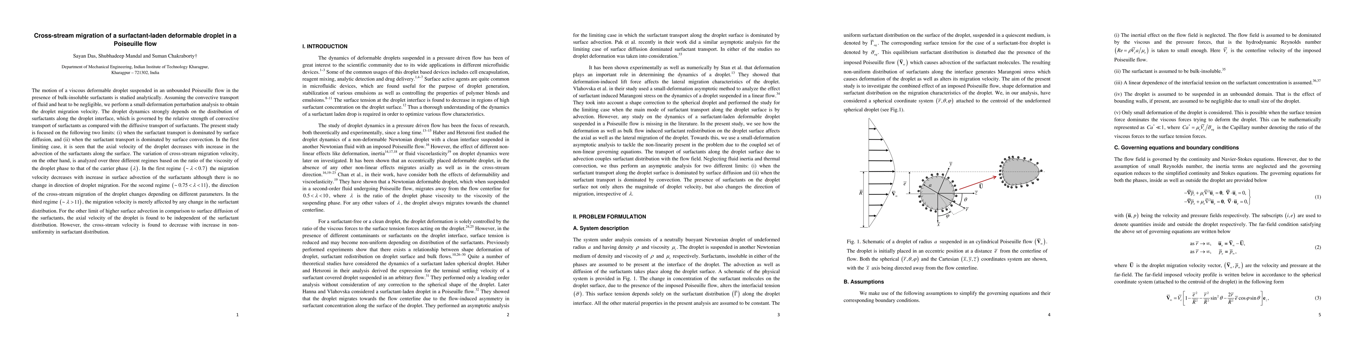 This paper analytically investigates the motion of a deformable droplet in Poiseuille flow with surfactants, focusing on the droplet's migration velocity and dynamics under two surfactant transport regimes: surface diffusion dominance and surface convection dominance. The study reveals varying effects on the droplet's axial and cross-stream migration velocities based on the surfactant distribution and the relative strength of transport mechanisms.