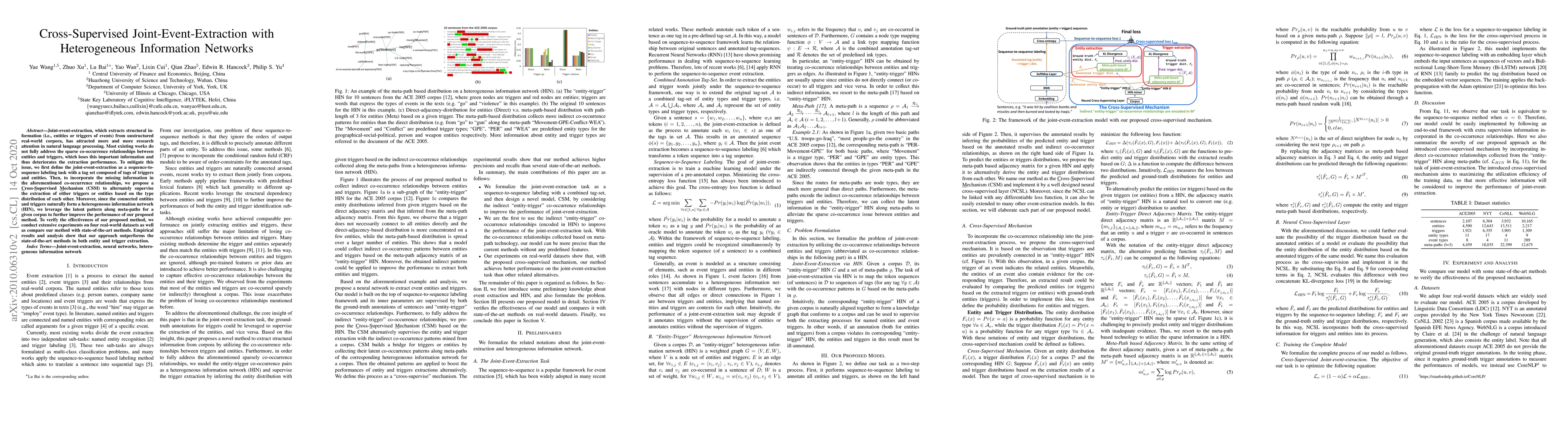 Joint-event-extraction, which extracts structural information (i.e., entities or triggers of events) from unstructured real-world corpora, has attracted more and more research attention in natural language processing. Most existing works do not fully address the sparse co-occurrence relationships between entities and triggers, which loses this important information and thus deteriorates the extraction performance. To mitigate this issue, we first define the joint-event-extraction as a sequence-to-sequence labeling task with a tag set composed of tags of triggers and entities. Then, to incorporate the missing information in the aforementioned co-occurrence relationships, we propose a Cross-Supervised Mechanism (CSM) to alternately supervise the extraction of either triggers or entities based on the type distribution of each other. Moreover, since the connected entities and triggers naturally form a heterogeneous information network (HIN), we leverage the latent pattern along meta-paths for a given corpus to further improve the performance of our proposed method. To verify the effectiveness of our proposed method, we conduct extensive experiments on four real-world datasets as well as compare our method with state-of-the-art methods. Empirical results and analysis show that our approach outperforms the state-of-the-art methods in both entity and trigger extraction.