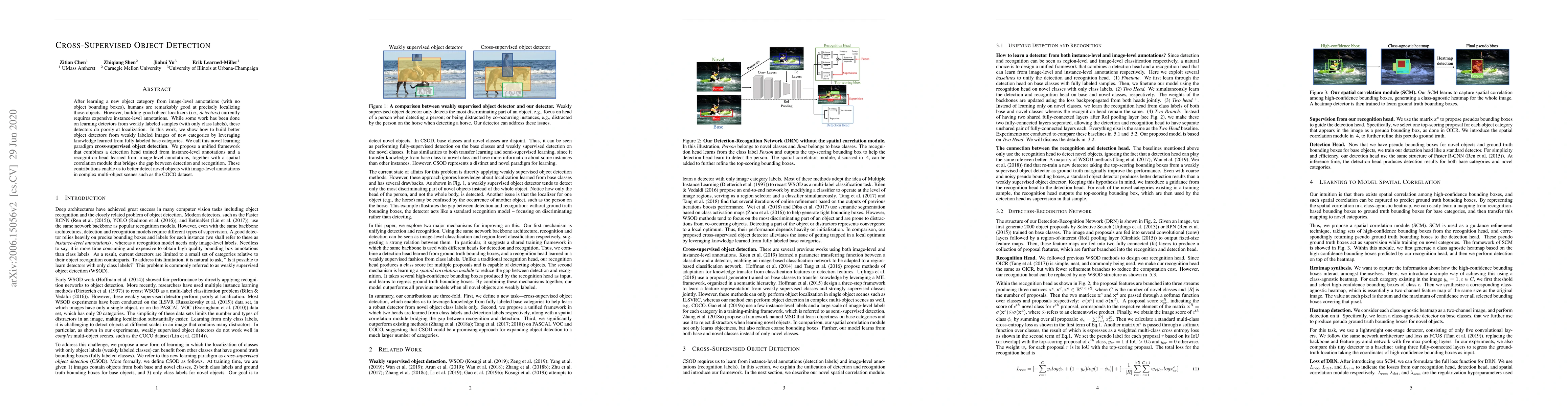 After learning a new object category from image-level annotations (with no object bounding boxes), humans are remarkably good at precisely localizing those objects. However, building good object localizers (i.e., detectors) currently requires expensive instance-level annotations. While some work has been done on learning detectors from weakly labeled samples (with only class labels), these detectors do poorly at localization. In this work, we show how to build better object detectors from weakly labeled images of new categories by leveraging knowledge learned from fully labeled base categories. We call this novel learning paradigm cross-supervised object detection. We propose a unified framework that combines a detection head trained from instance-level annotations and a recognition head learned from image-level annotations, together with a spatial correlation module that bridges the gap between detection and recognition. These contributions enable us to better detect novel objects with image-level annotations in complex multi-object scenes such as the COCO dataset.