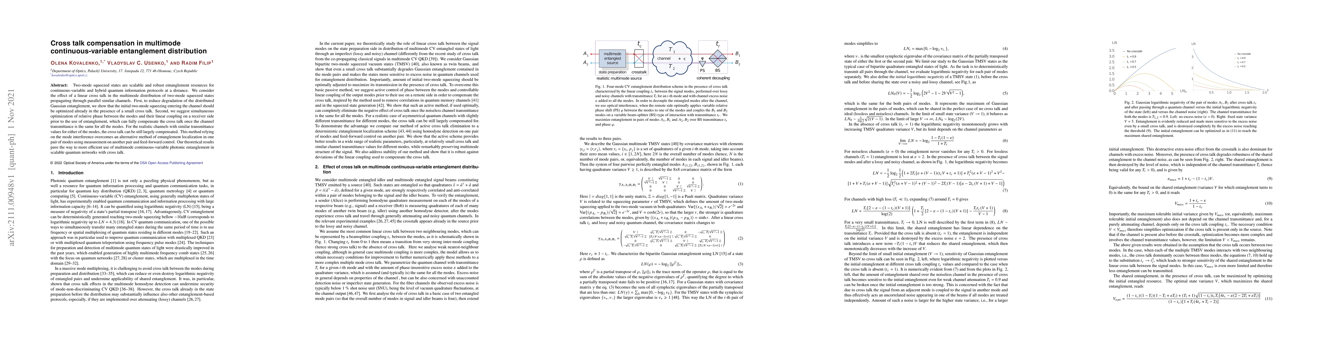 Two-mode squeezed states are scalable and robust entanglement resources for continuous-variable and hybrid quantum information protocols at a distance. We consider the effect of a linear cross talk in the multimode distribution of two-mode squeezed states propagating through parallel similar channels. First, to reduce degradation of the distributed Gaussian entanglement, we show that the initial two-mode squeezing entering the channel should be optimized already in the presence of a small cross talk. Second, we suggest simultaneous optimization of relative phase between the modes and their linear coupling on a receiver side prior to the use of entanglement, which can fully compensate the cross talk once the channel transmittance is the same for all the modes. For the realistic channels with similar transmittance values for either of the modes, the cross talk can be still largely compensated. This method relying on the mode interference overcomes an alternative method of entanglement localization in one pair of modes using measurement on another pair and feed-forward control. Our theoretical results pave the way to more efficient use of multimode continuous-variable photonic entanglement in scalable quantum networks with cross talk.