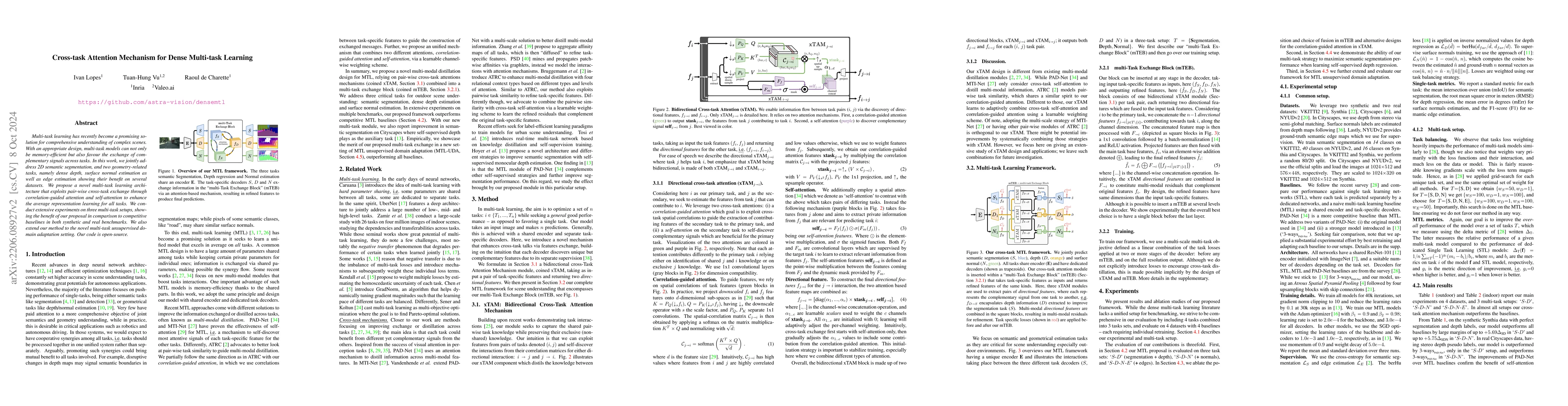 This paper proposes a novel multi-task learning architecture that utilizes cross-task attention mechanisms to enhance representation learning across tasks, including semantic segmentation, dense depth, surface normal estimation, and edge estimation. The method demonstrates improved performance over baselines in both synthetic and real datasets, and is extended to unsupervised domain adaptation.