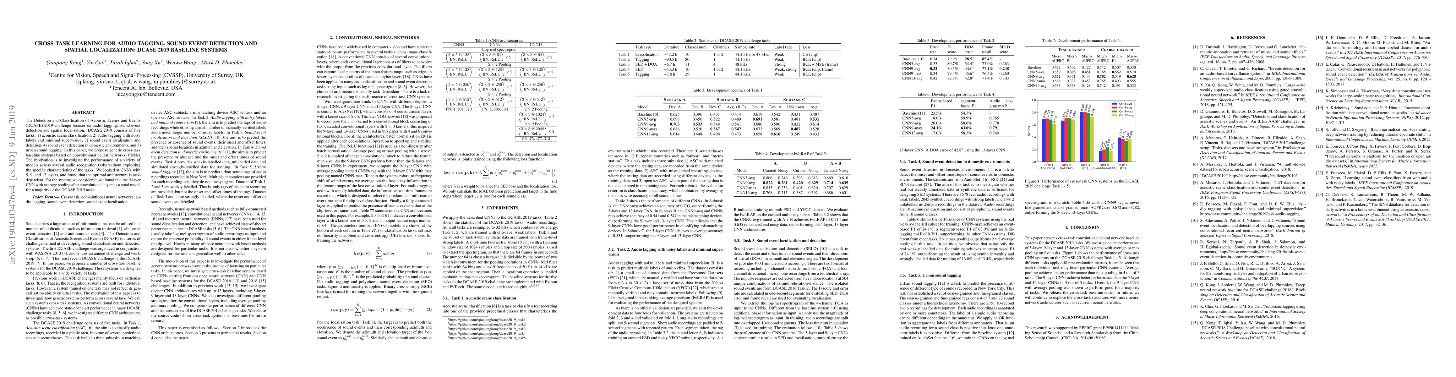 The Detection and Classification of Acoustic Scenes and Events (DCASE) 2019 challenge focuses on audio tagging, sound event detection and spatial localisation. DCASE 2019 consists of five tasks: 1) acoustic scene classification, 2) audio tagging with noisy labels and minimal supervision, 3) sound event localisation and detection, 4) sound event detection in domestic environments, and 5) urban sound tagging. In this paper, we propose generic cross-task baseline systems based on convolutional neural networks (CNNs). The motivation is to investigate the performance of a variety of models across several audio recognition tasks without exploiting the specific characteristics of the tasks. We looked at CNNs with 5, 9, and 13 layers, and found that the optimal architecture is task-dependent. For the systems we considered, we found that the 9-layer CNN with average pooling after convolutional layers is a good model for a majority of the DCASE 2019 tasks.