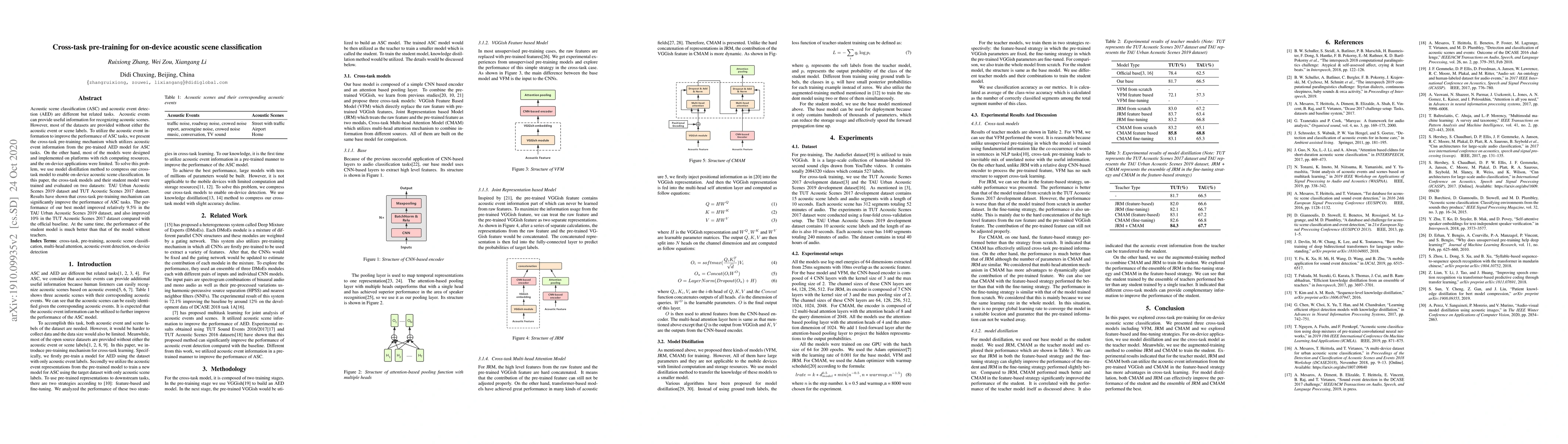 Acoustic scene classification (ASC) and acoustic event detection (AED) are different but related tasks. Acoustic events can provide useful information for recognizing acoustic scenes. However, most of the datasets are provided without either the acoustic event or scene labels. To utilize the acoustic event information to improve the performance of ASC tasks, we present the cross-task pre-training mechanism which utilizes acoustic event information from the pre-trained AED model for ASC tasks. On the other hand, most of the models were designed and implemented on platforms with rich computing resources, and the on-device applications were limited. To solve this problem, we use model distillation method to compress our cross-task model to enable on-device acoustic scene classification. In this paper, the cross-task models and their student model were trained and evaluated on two datasets: TAU Urban Acoustic Scenes 2019 dataset and TUT Acoustic Scenes 2017 dataset. Results have shown that cross-task pre-training mechanism can significantly improve the performance of ASC tasks. The performance of our best model improved relatively 9.5% in the TAU Urban Acoustic Scenes 2019 dataset, and also improved 10% in the TUT Acoustic Scenes 2017 dataset compared with the official baseline. At the same time, the performance of the student model is much better than that of the model without teachers.