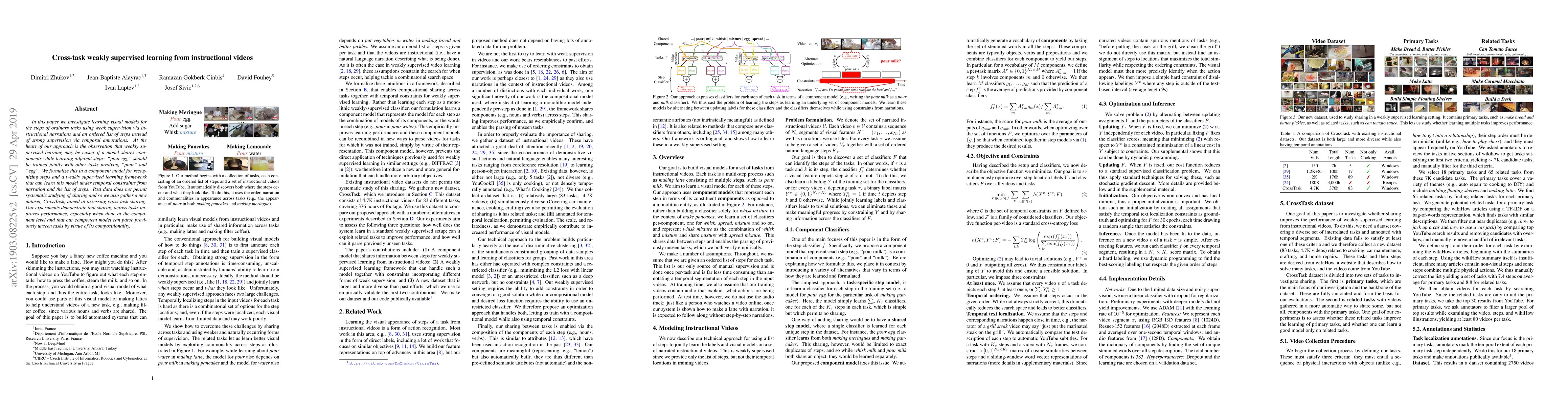 This paper explores weakly supervised learning for recognizing task steps from instructional videos using narrations and step lists, proposing a component model that shares components across tasks to improve performance. Experiments on a new dataset, CrossTask, show that cross-task sharing, especially at the component level, enhances model performance and enables parsing of new tasks.