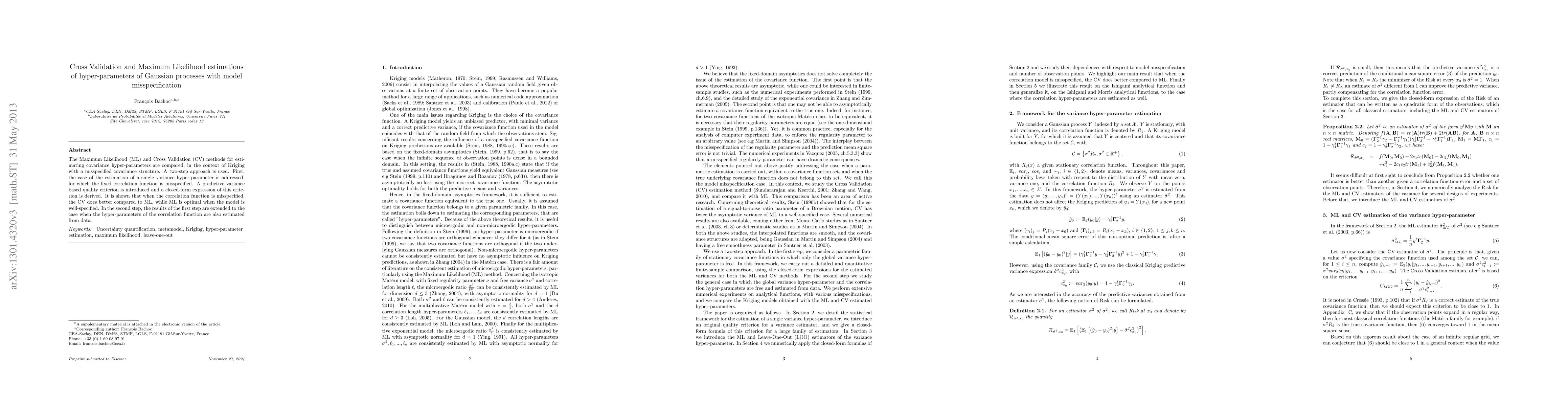 This paper compares Maximum Likelihood (ML) and Cross Validation (CV) methods for estimating hyper-parameters in Gaussian processes, particularly when the covariance structure is misspecified. It finds that CV performs better than ML under misspecification, while ML is optimal when the model is correctly specified. The study extends these findings to scenarios where both variance and correlation function hyper-parameters are estimated.