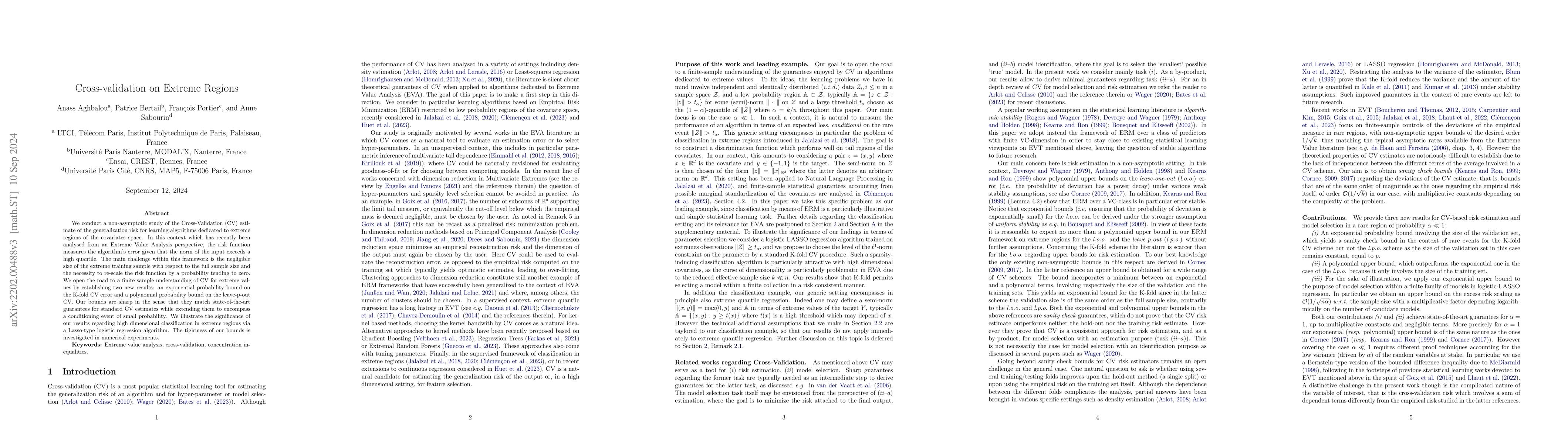 This paper studies the Cross Validation (CV) estimate for algorithms analyzing extreme regions in covariate space, addressing the challenge of small extreme training samples. It establishes sharp bounds for \Kfold and leave-\textrm{p}-out CV errors, extending standard guarantees to low-probability events, and demonstrates their relevance through a Lasso-type logistic regression example.