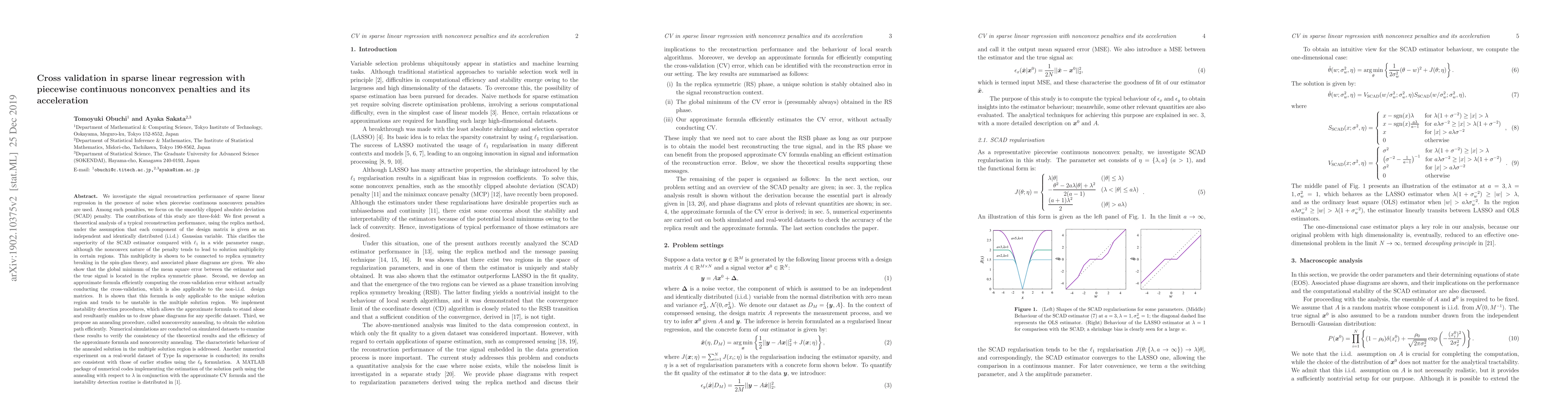 We investigate the signal reconstruction performance of sparse linear regression in the presence of noise when piecewise continuous nonconvex penalties are used. Among such penalties, we focus on the SCAD penalty. The contributions of this study are three-fold: We first present a theoretical analysis of a typical reconstruction performance, using the replica method, under the assumption that each component of the design matrix is given as an independent and identically distributed (i.i.d.) Gaussian variable. This clarifies the superiority of the SCAD estimator compared with $\ell_1$ in a wide parameter range, although the nonconvex nature of the penalty tends to lead to solution multiplicity in certain regions. This multiplicity is shown to be connected to replica symmetry breaking in the spin-glass theory. We also show that the global minimum of the mean square error between the estimator and the true signal is located in the replica symmetric phase. Second, we develop an approximate formula efficiently computing the cross-validation error without actually conducting the cross-validation, which is also applicable to the non-i.i.d. design matrices. It is shown that this formula is only applicable to the unique solution region and tends to be unstable in the multiple solution region. We implement instability detection procedures, which allows the approximate formula to stand alone and resultantly enables us to draw phase diagrams for any specific dataset. Third, we propose an annealing procedure, called nonconvexity annealing, to obtain the solution path efficiently. Numerical simulations are conducted on simulated datasets to examine these results to verify the theoretical results consistency and the approximate formula efficiency. Another numerical experiment on a real-world dataset is conducted; its results are consistent with those of earlier studies using the $\ell_0$ formulation.