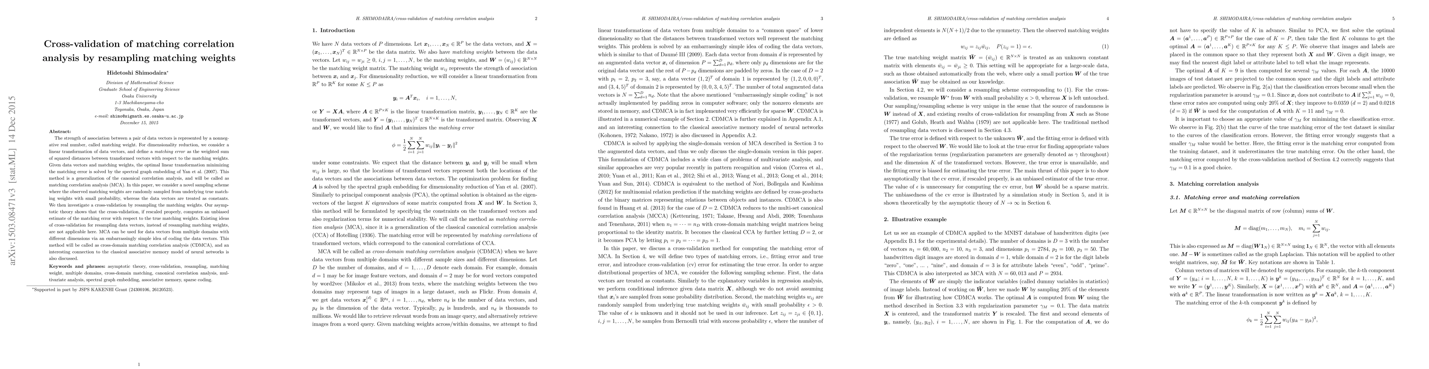 This paper introduces a cross-validation method for matching correlation analysis (MCA) by resampling matching weights, showing it provides an unbiased estimate of matching error. It also extends MCA to cross-domain matching correlation analysis (CDMCA) and discusses its connection to neural network associative memory models.